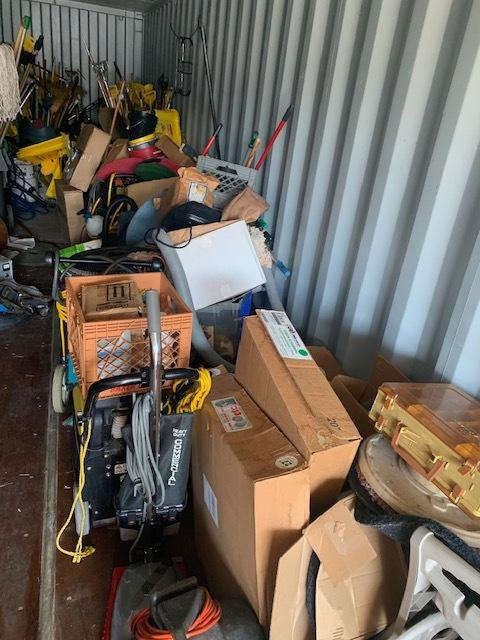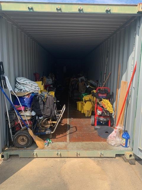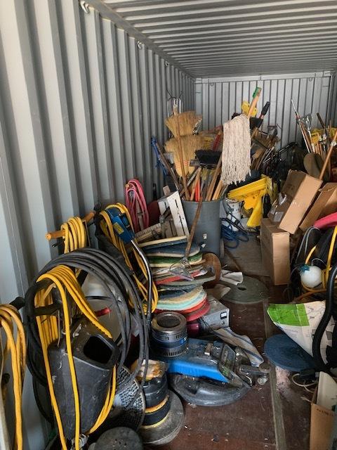 This unit appears to contain…TroyBilt pressure washer, buffers, cleaning supplies, vacuum cleaners, mop buckets and caution signs.