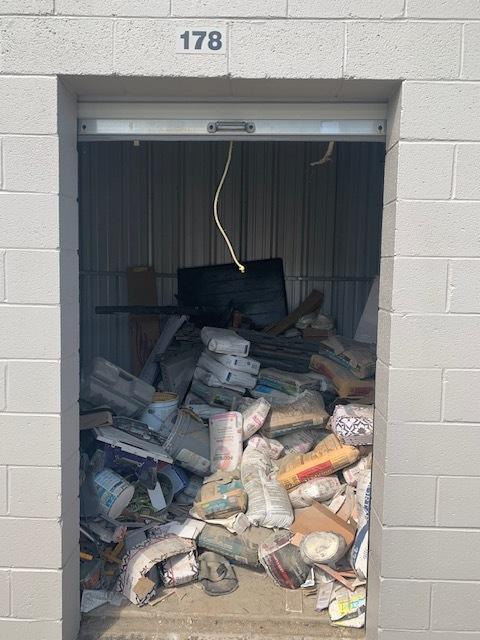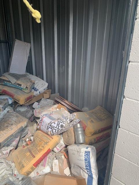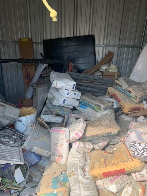 This unit appears to contain…sanded grout bags, bags of mortar, paint buckets, flooring materials and supplies.