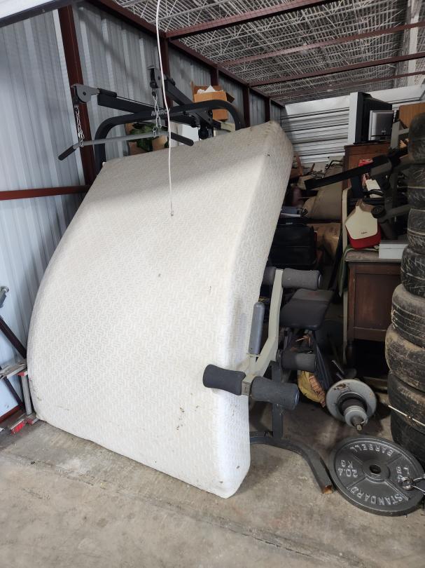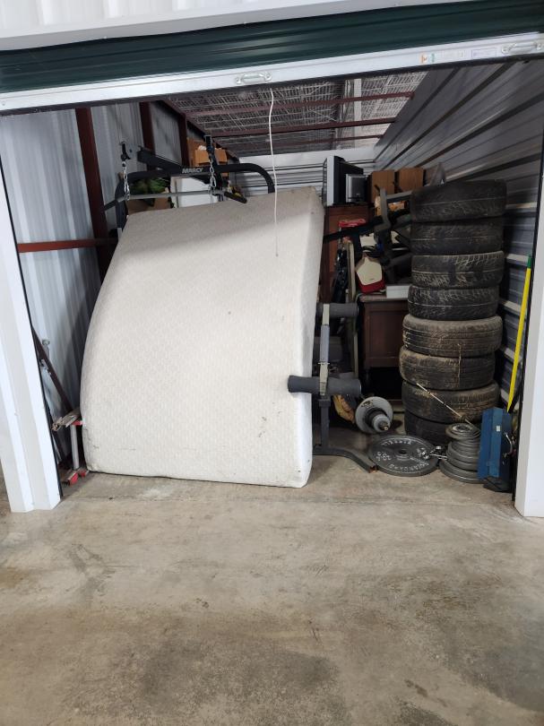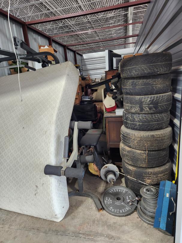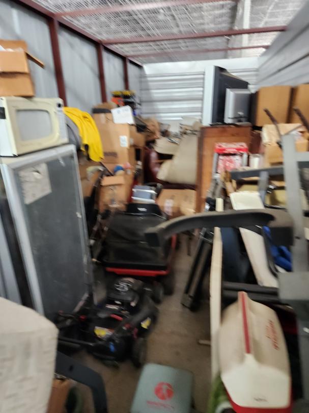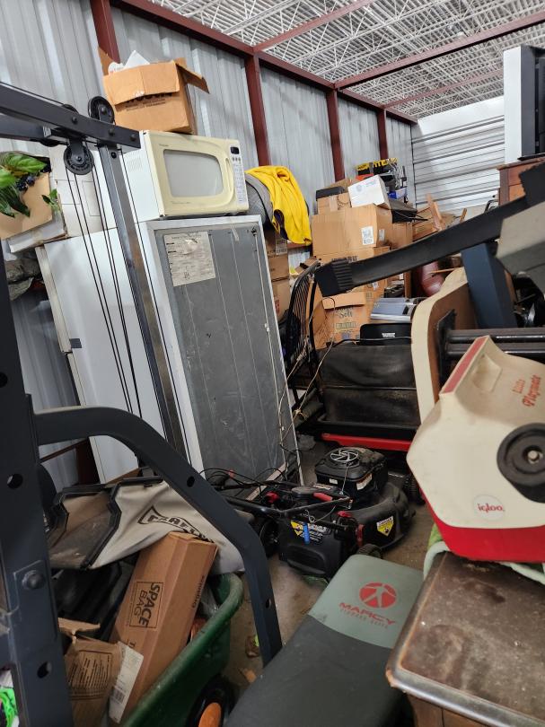 This unit appears to contain…weight equipment, refrigerator, boxes, microwave, lawn mower, tv, speakers, mattress