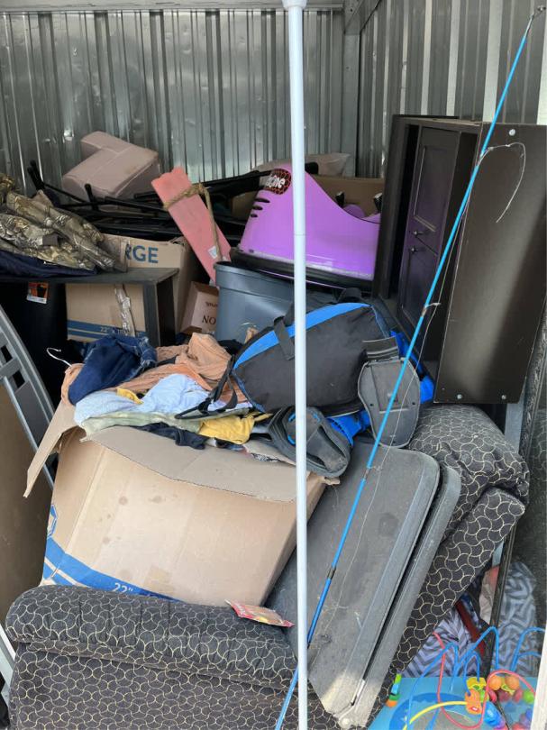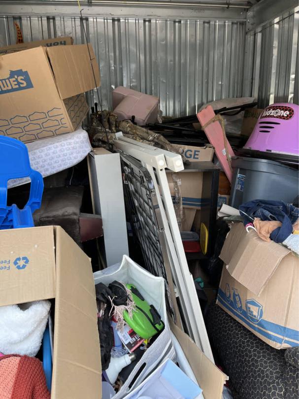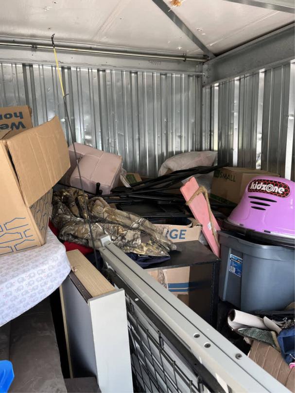 This unit appears to contain…boxes, bins, bed frame, mattress, cabinet, chairs, fishing pole, mirror, lamp, folding chairs, toys, couch, clothes, shoes