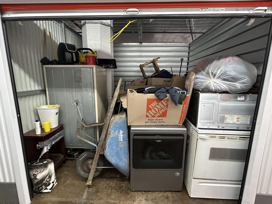 This unit appears to contain…microwave, washer, dryer, fridge, tools, boxes
