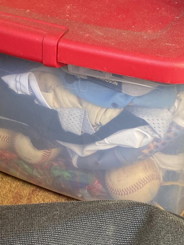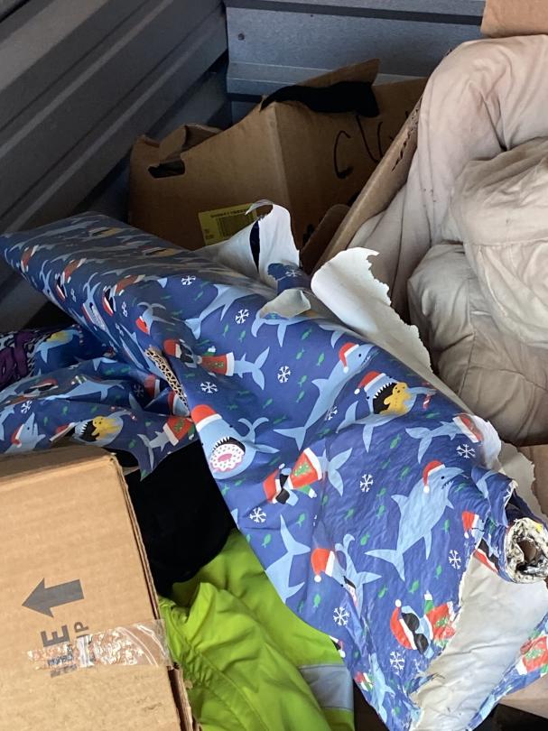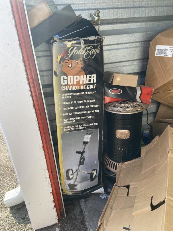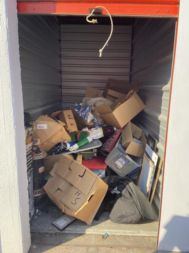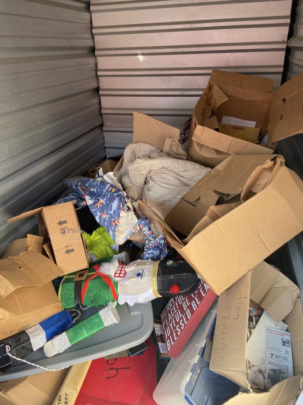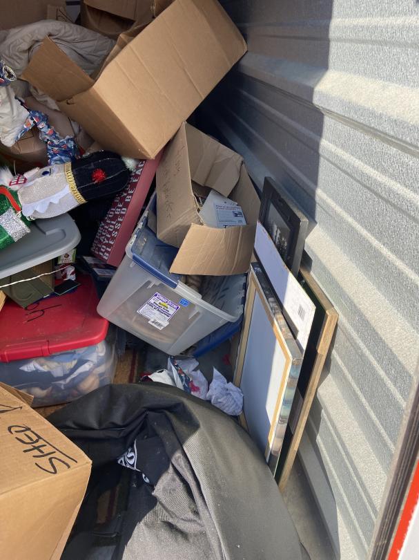 This unit appears to contain…Unit appears to contain: Christmas decorations, misc. boxes, electric heater, misc. tupperware boxes, pictures, baseballs, baseball mitt