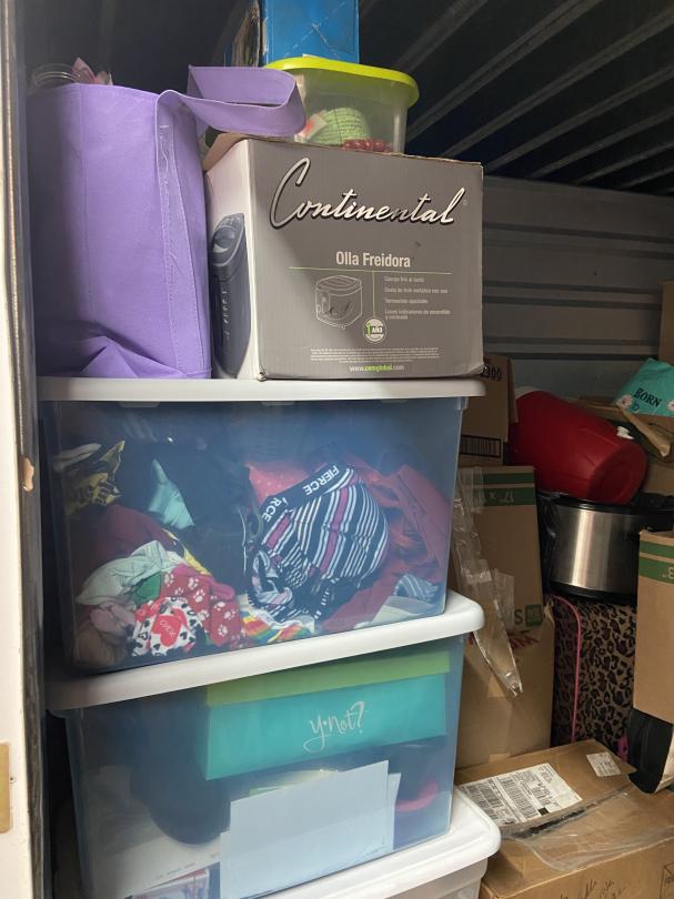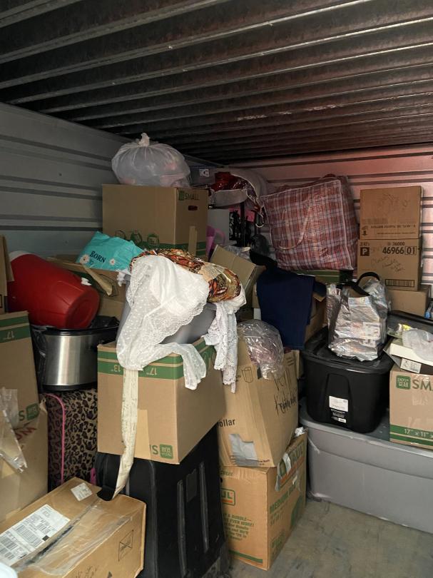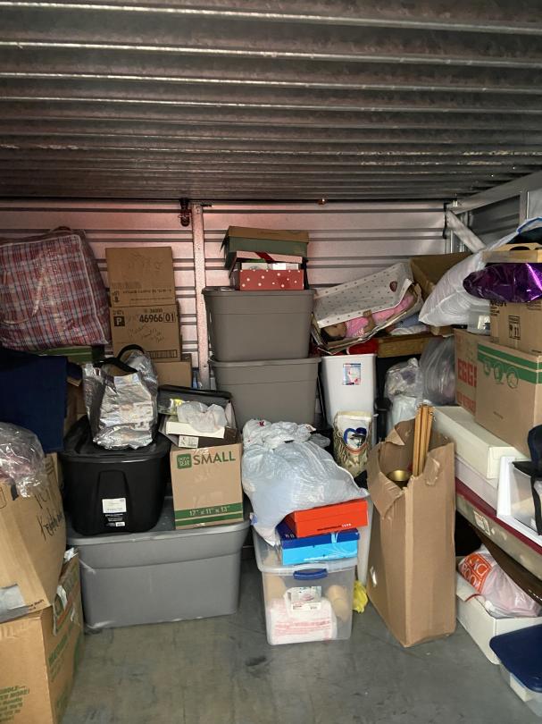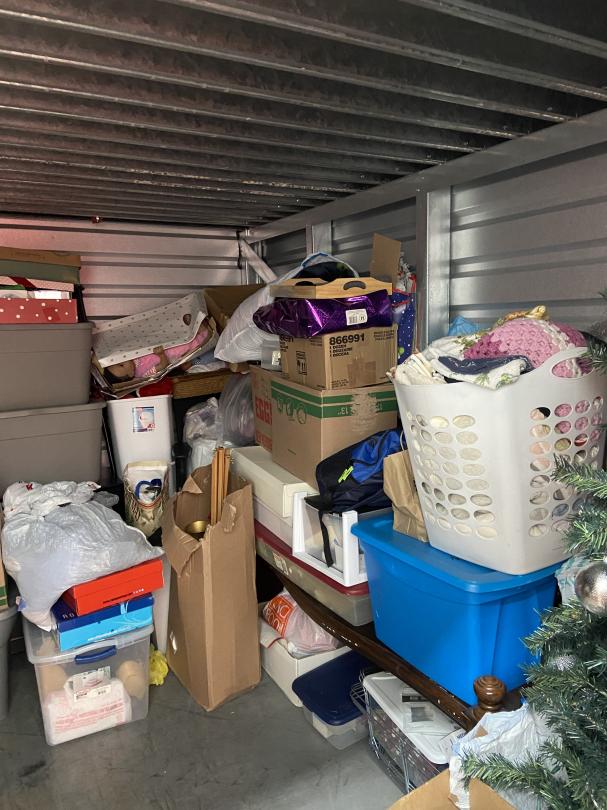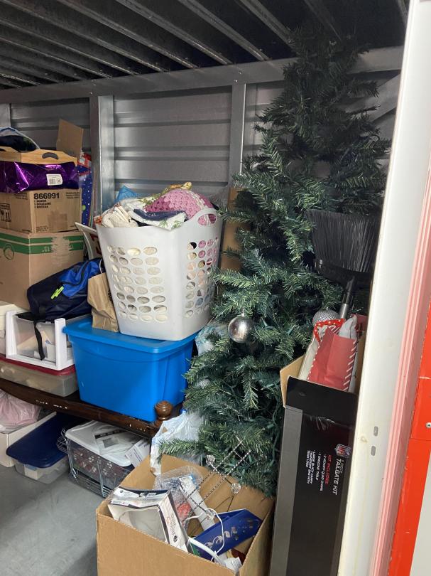 This unit appears to contain…Unit appears to contain Christmas tree, comforter, serving tray, quilt, towels, clothes, luggage, crockpot, misc. boxes and tupperware