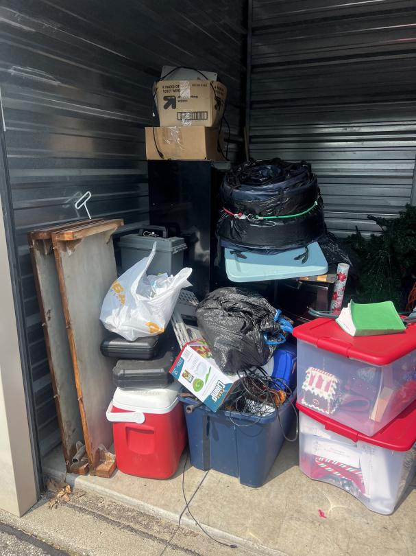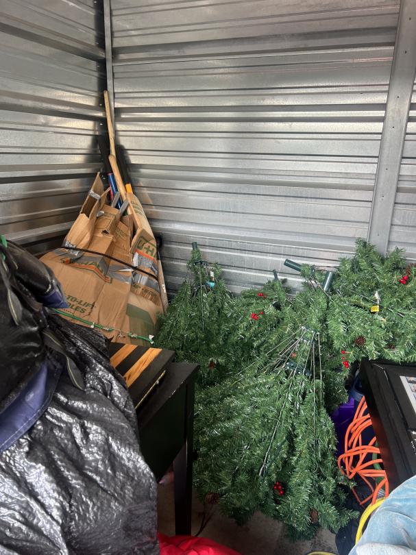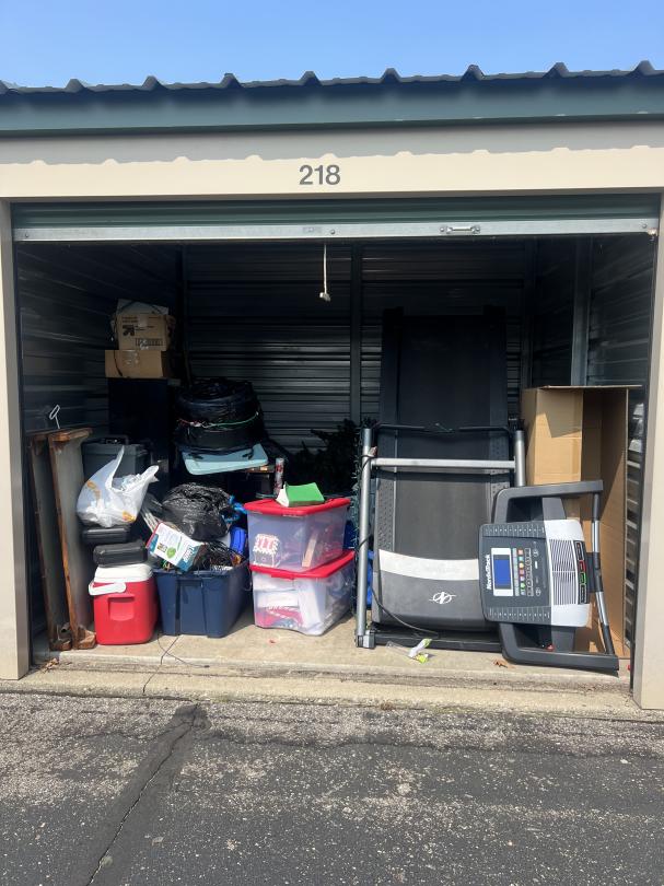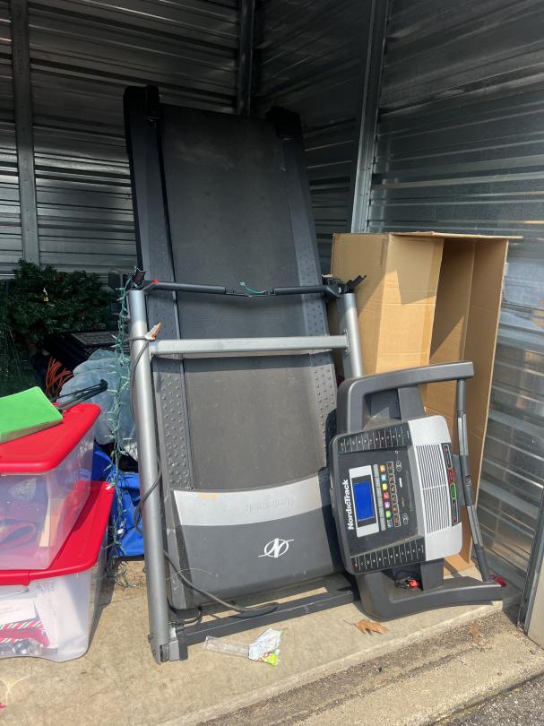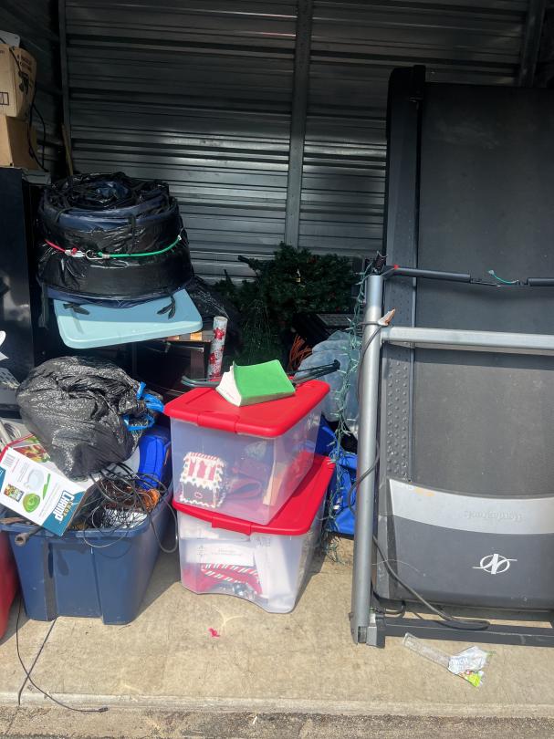 This unit appears to contain…treadmill, christmas tree, tubs, boxes, table, folding chair,