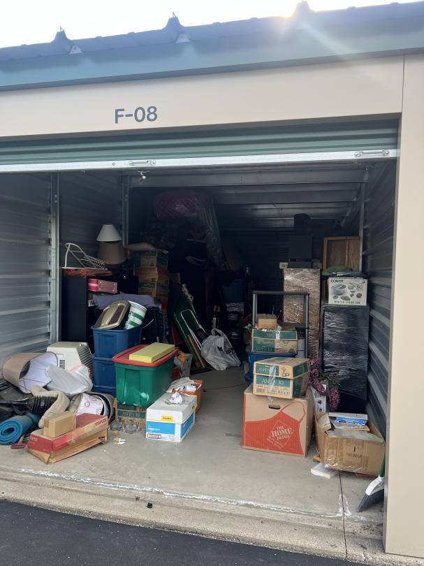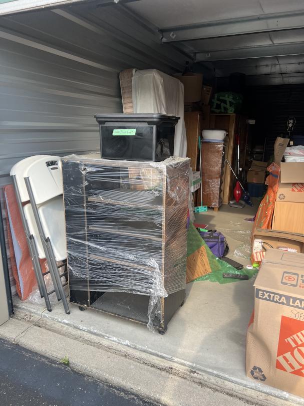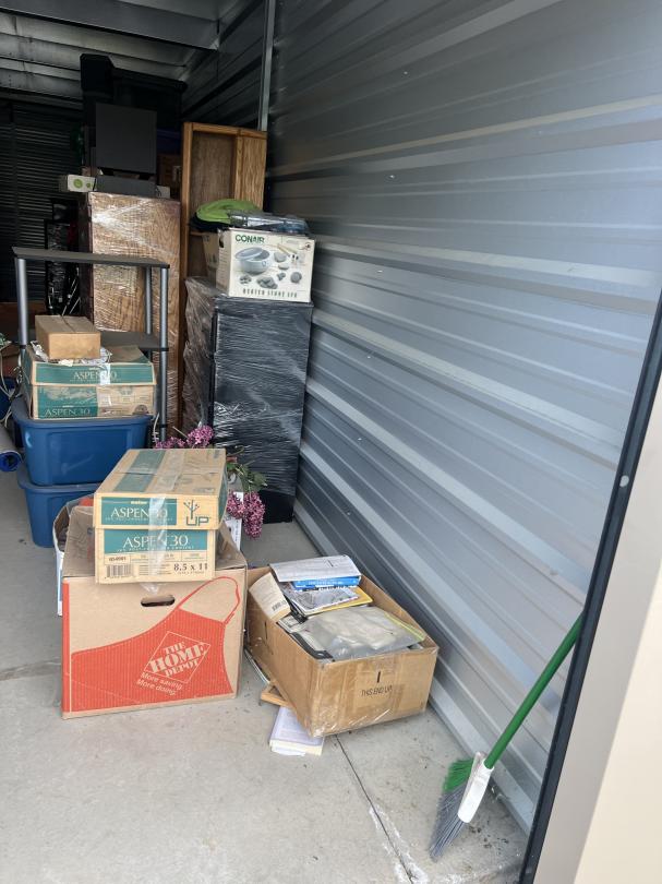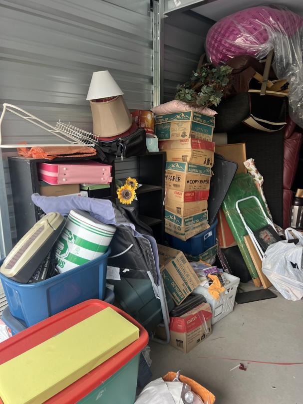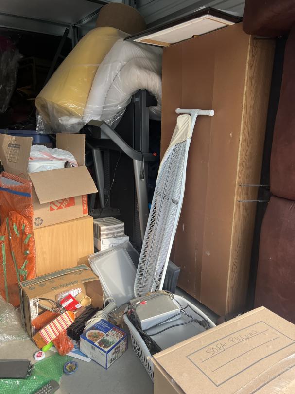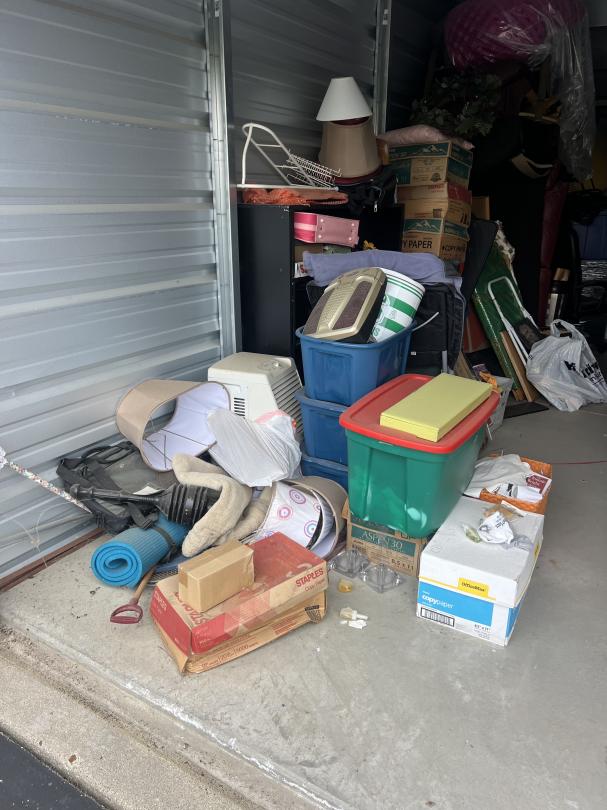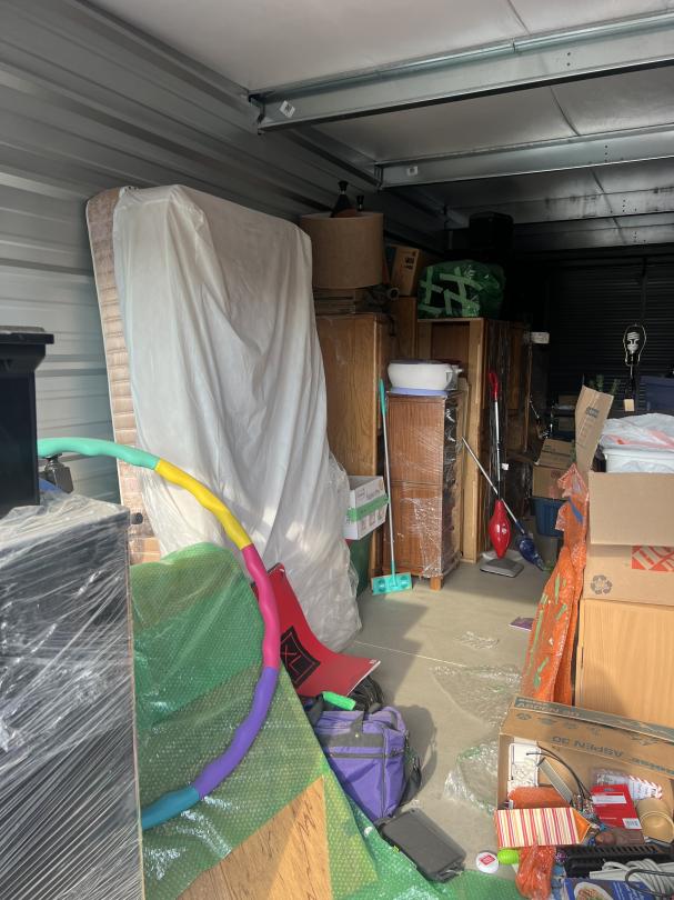 This unit appears to contain…furiture, boxes, ironing board, mattress, tubs, bags, dresser