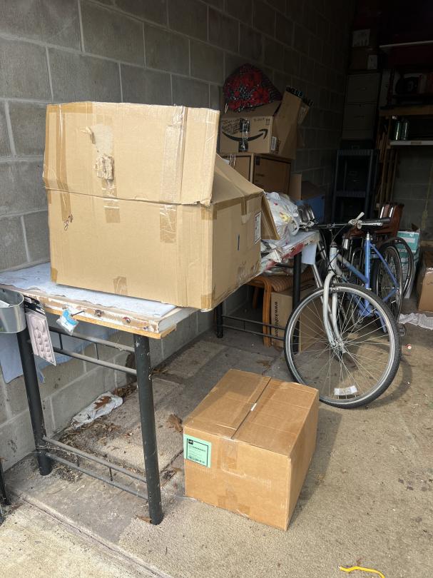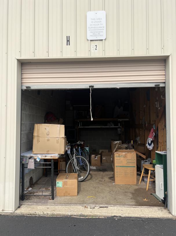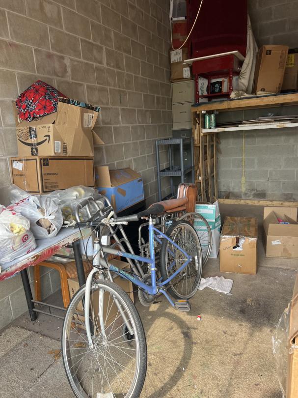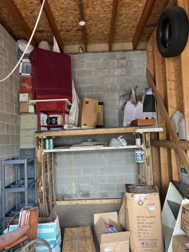 This unit appears to contain…Work table, bike, furniture, various items, file cabinets, wooden shelving