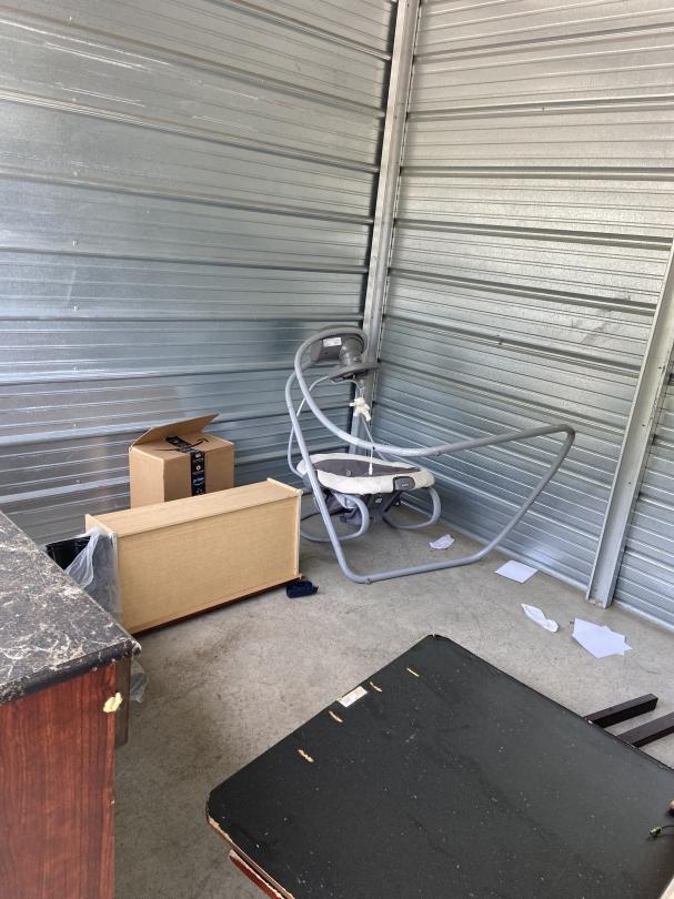 This unit appears to contain…Unit seems to contain dresser, rain boots, baby swing