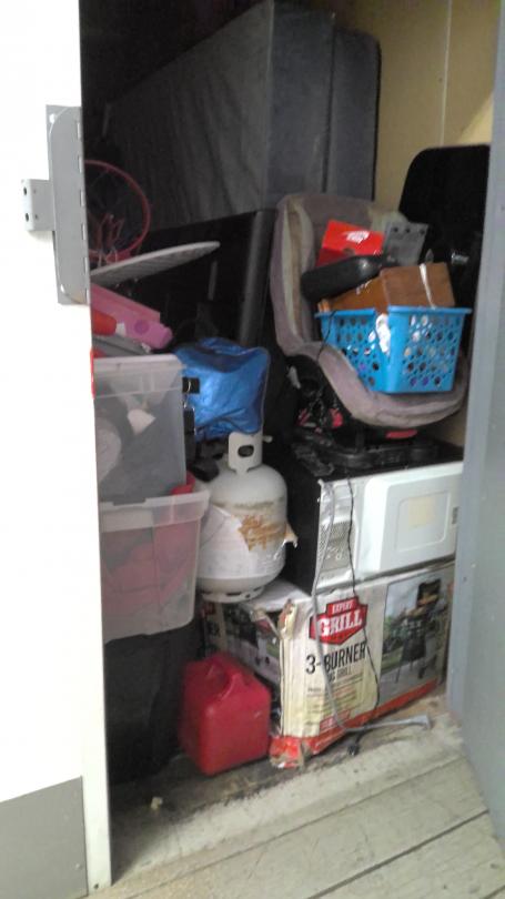 This unit appears to contain…Full, TV, microwave, basketball hoop, car seat, household and kitchen items, outdoor items, clothes and totes