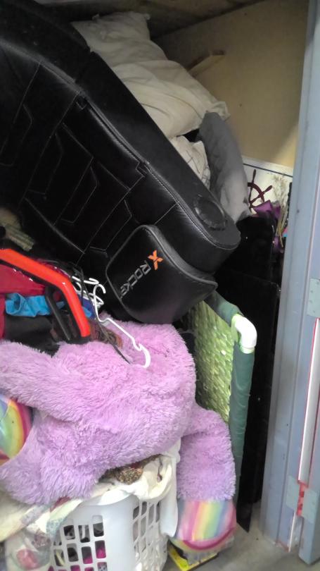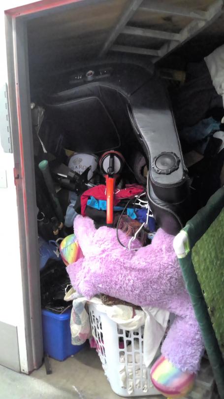 This unit appears to contain…Game chair, tools, furniture, vacuum, ladder, baby gate, toys, household items, clothing, tubs and baskets