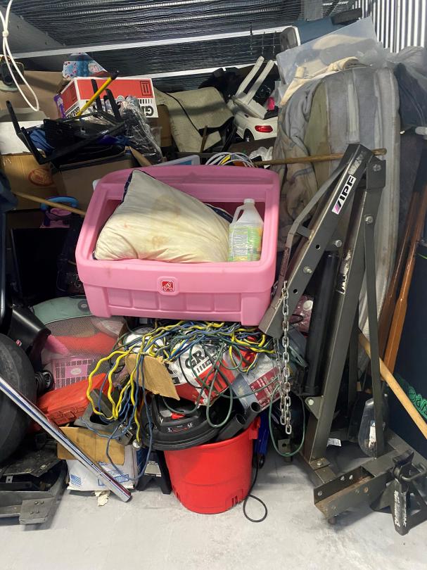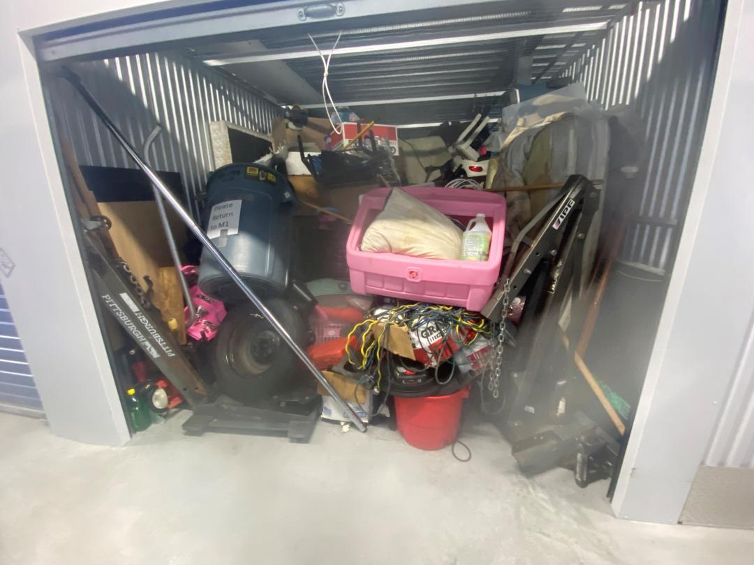 This unit appears to contain…Boxes, totes, household items, yard tools, kids toys, tire, misc items