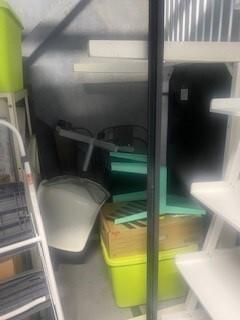 This unit appears to contain…Misc items, totes, shelving, boxes, step stool