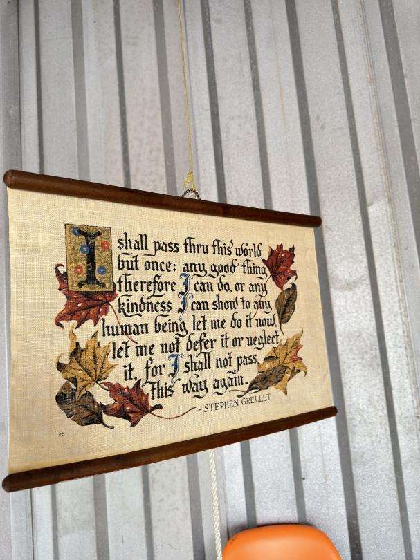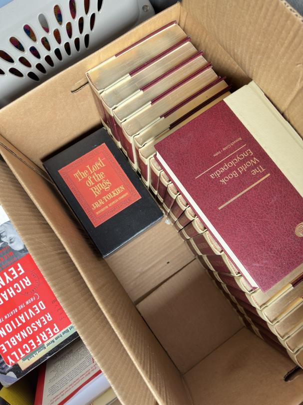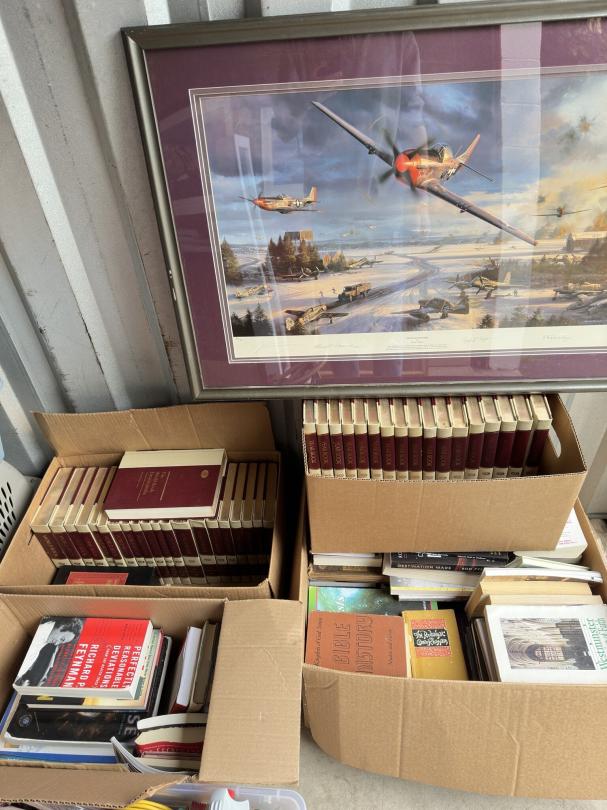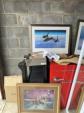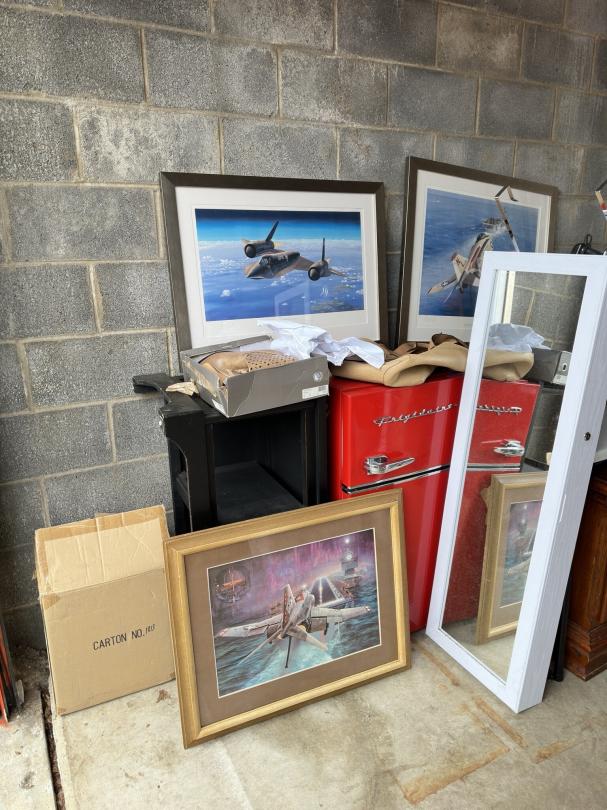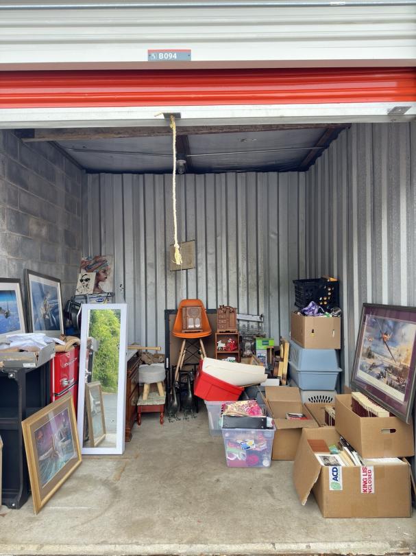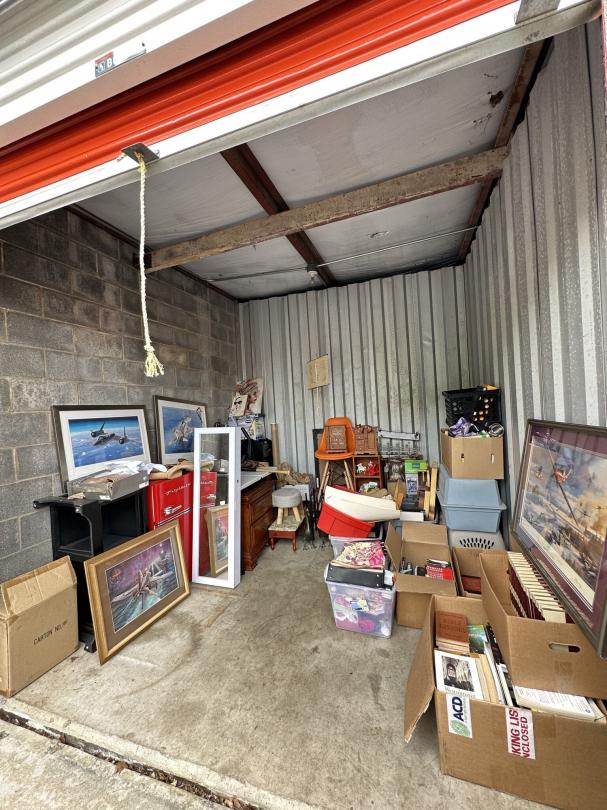 This unit appears to contain…Print with signature, refrigerator, chairs, table, mirror , shoes, home decor, nightstands , collectible books, bags, yard decor, vacuum cleaners, dishes.
