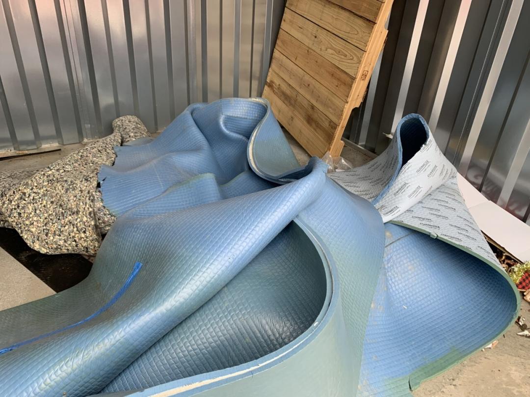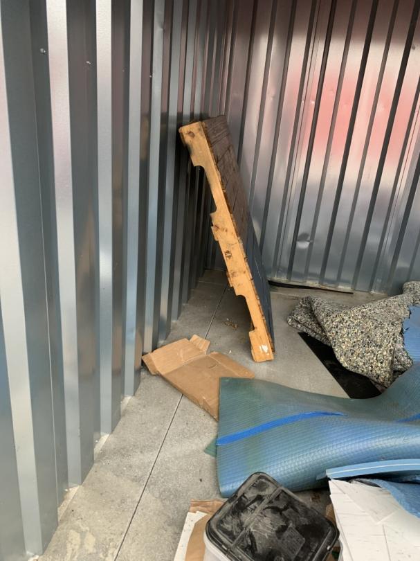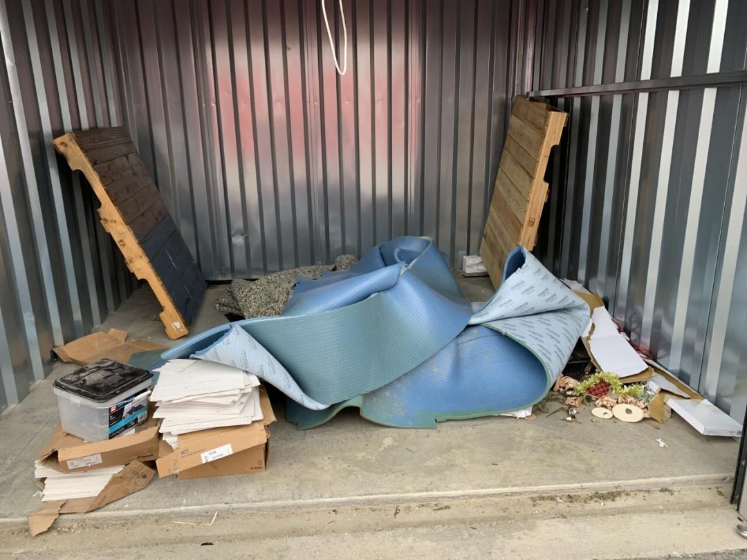 This unit appears to contain…Box Tiles-2 Skids-Carpet padding-Box of nails-Broom-Looks like Christmas Items.