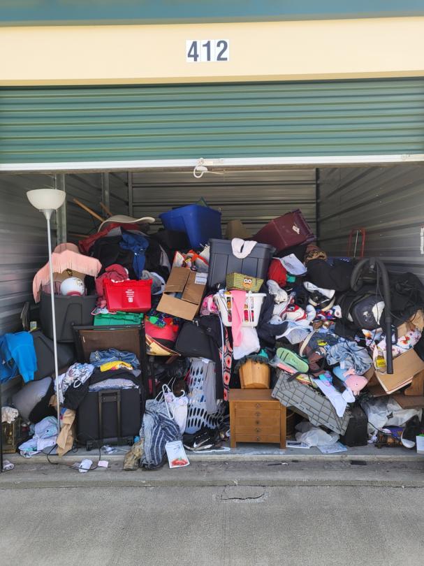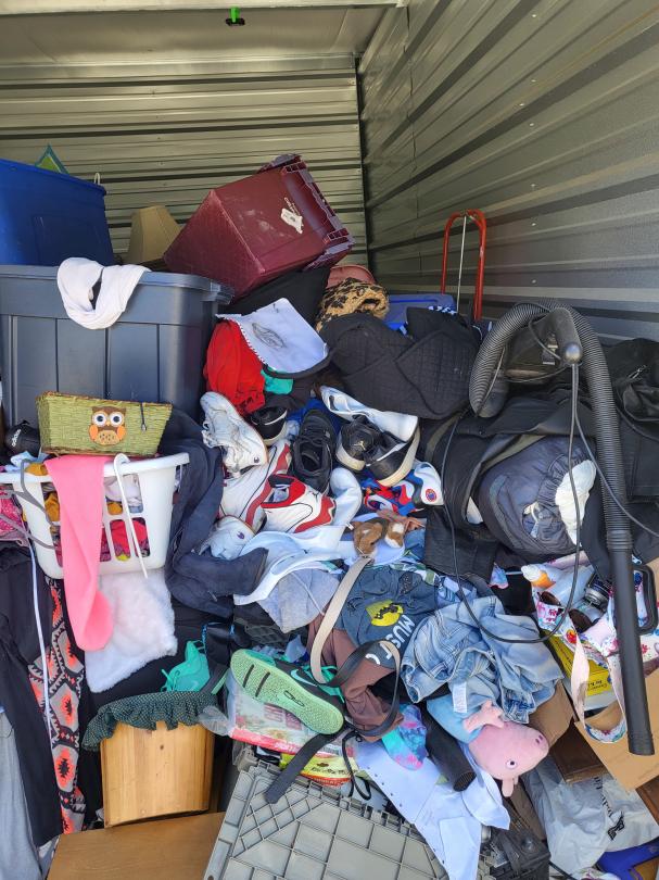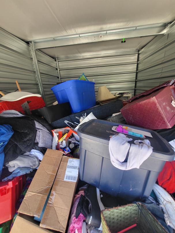 This unit appears to contain…10x15 unit filled with clothing, boxes, totes, furniture, lamps, vacuum, and more.