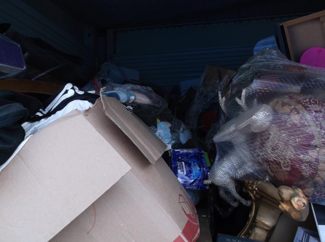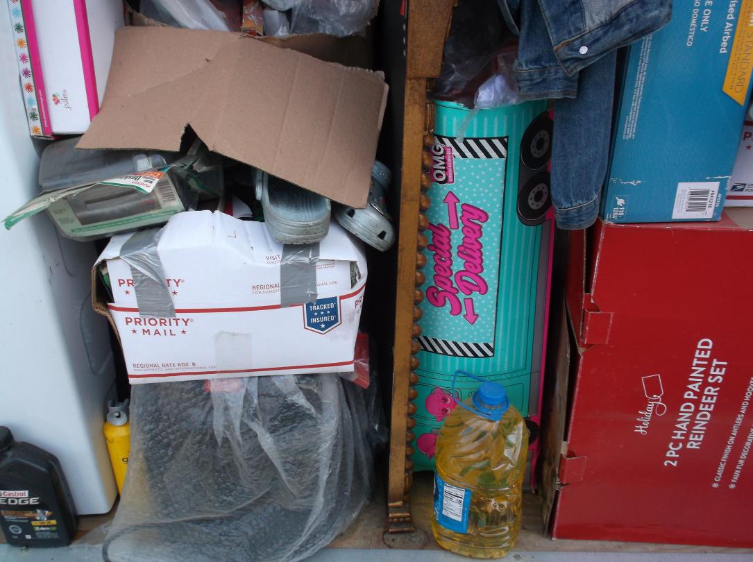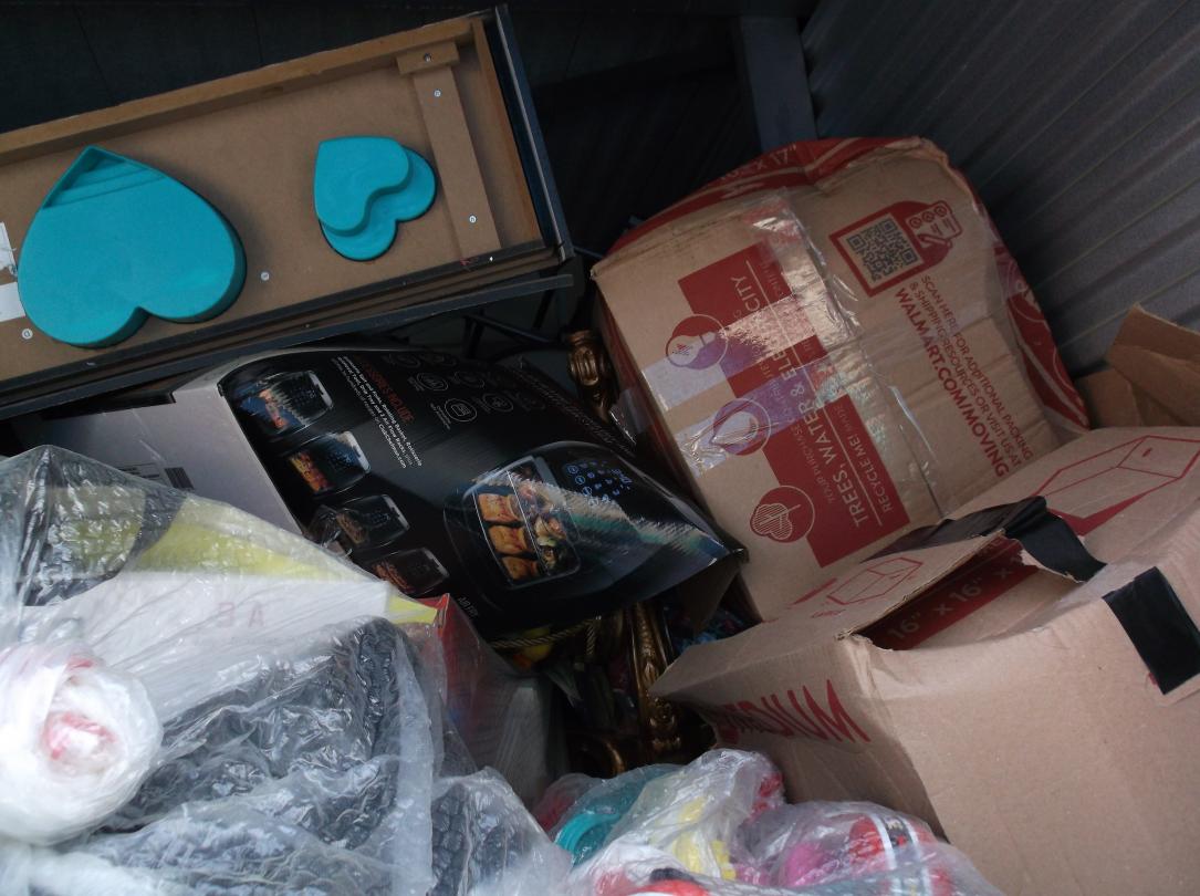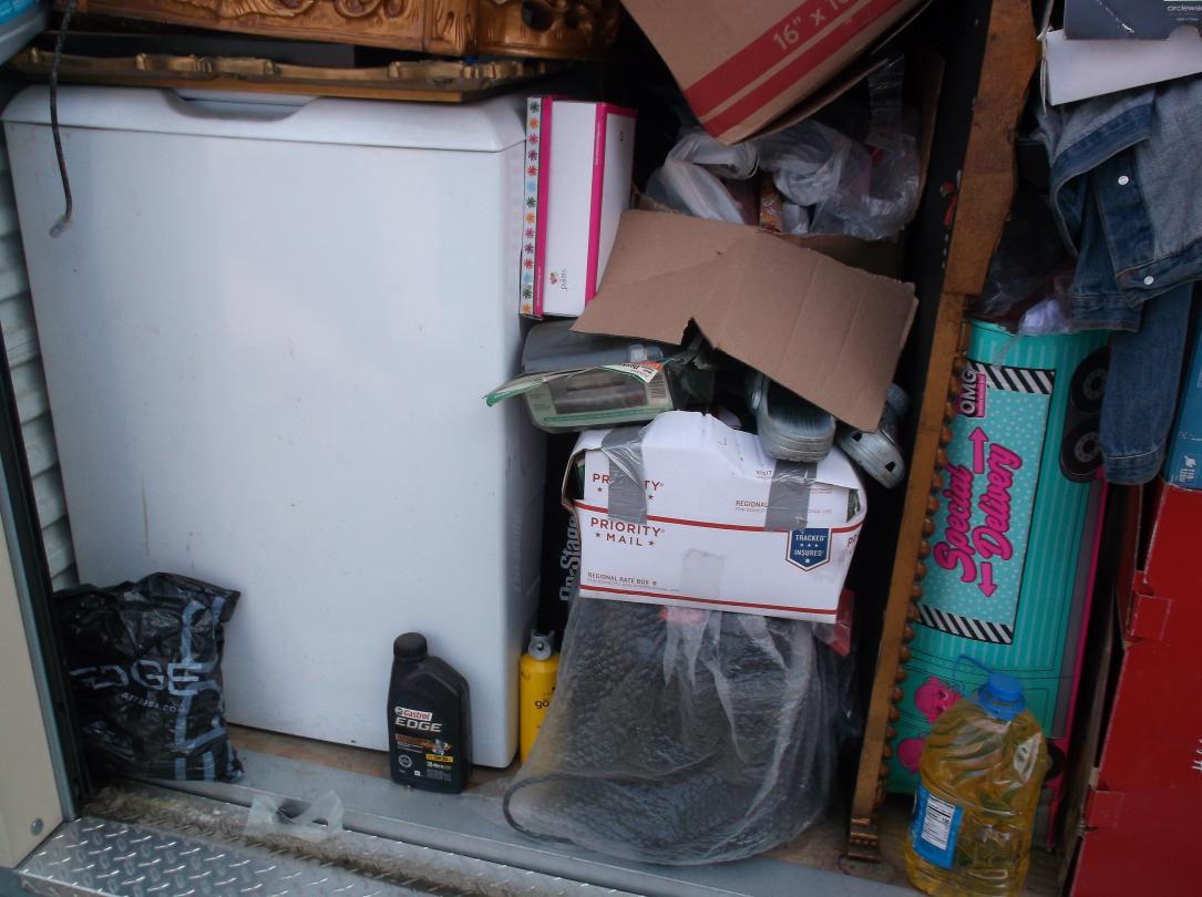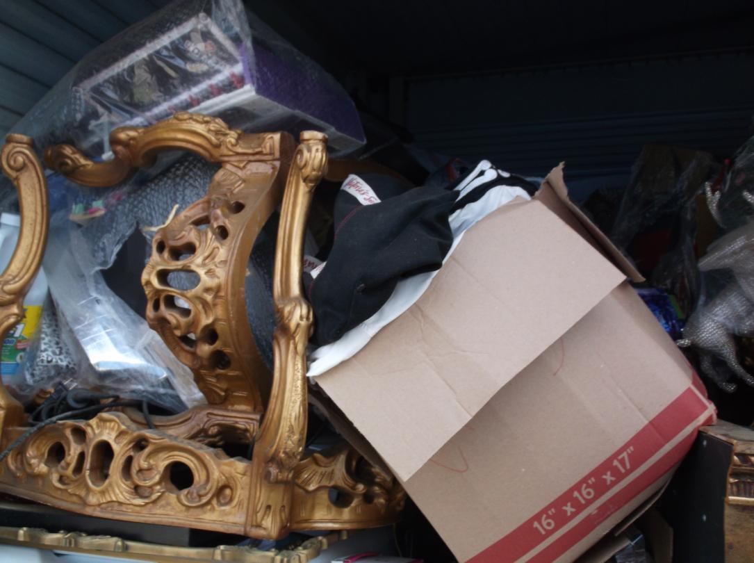 This unit appears to contain…Gold tables, Gold Headboard, Boxes, bags, Christmas items, Totes, Washer and Dryer