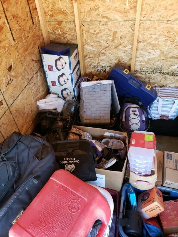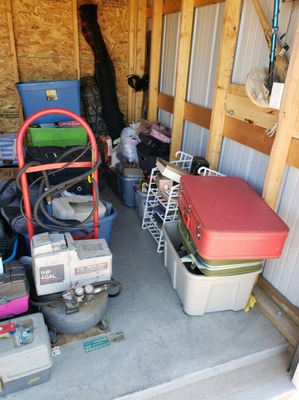 This unit appears to contain…Vintage suitcases, air compressor, snowboard, tackle box, light fixtures, cooler, gas can, athletic bag, backpacks, electronic game,
