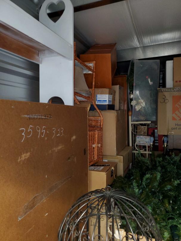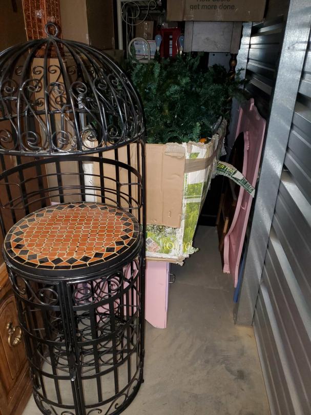This unit appears to contain…Inventory: portable sewing machine, cage/rack, christmas tree, mirrors, holiday items, numerous boxes, small table, end table