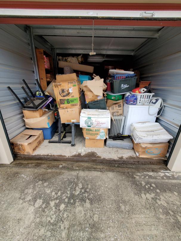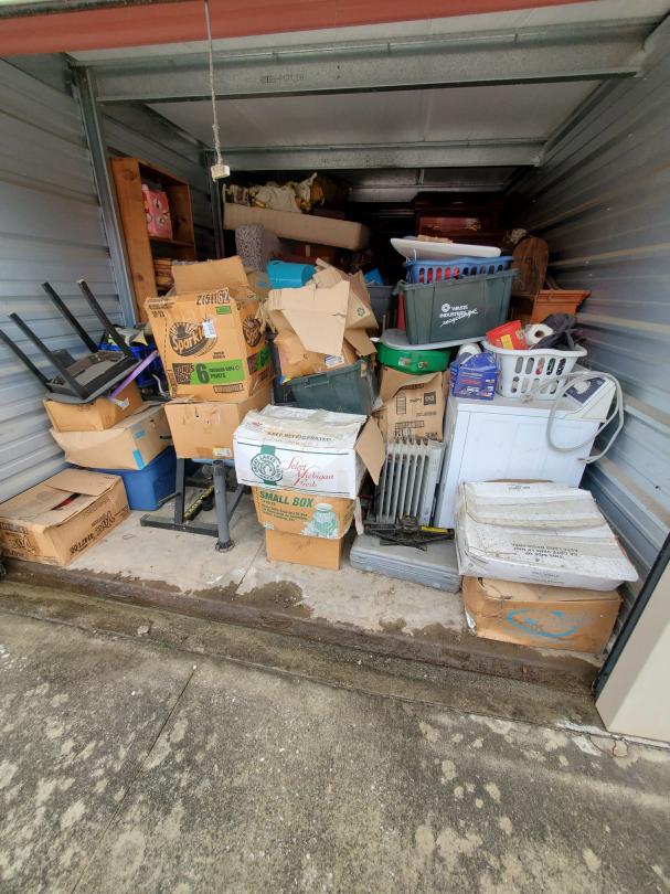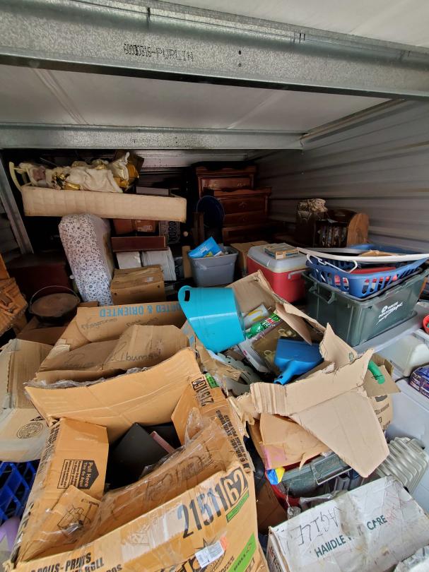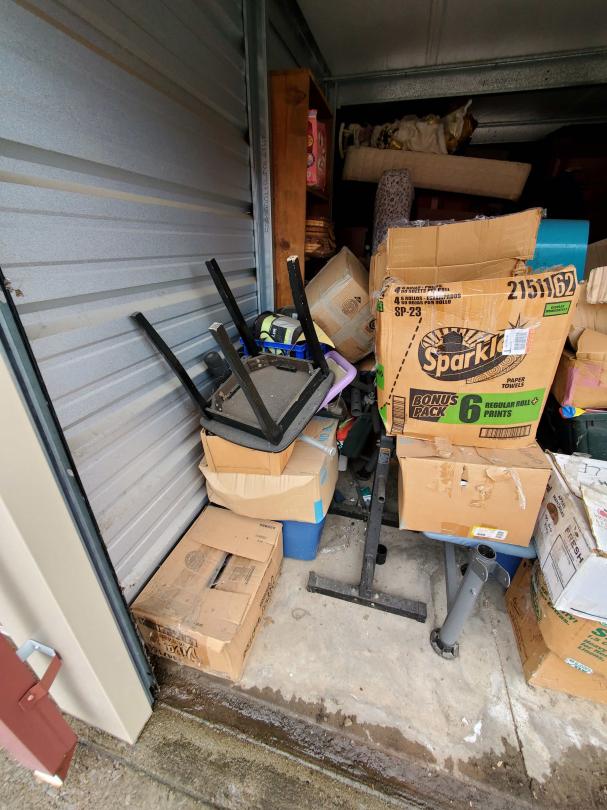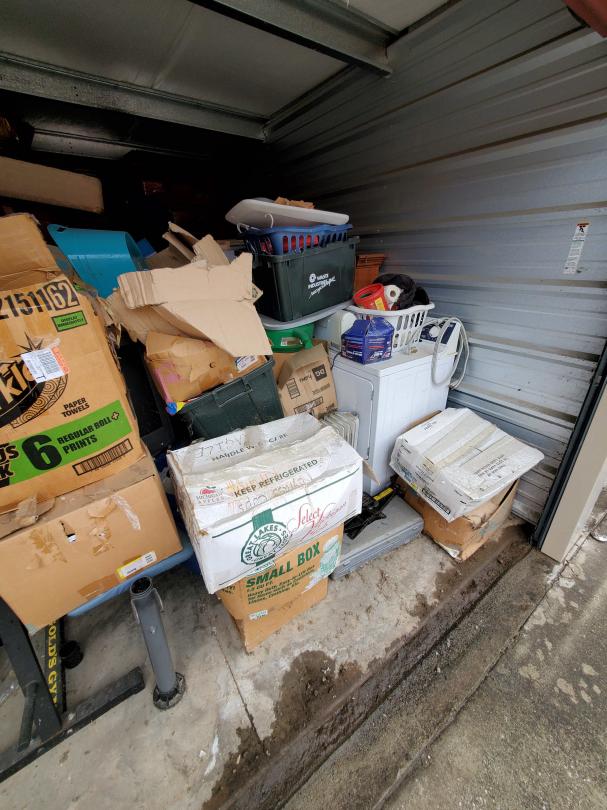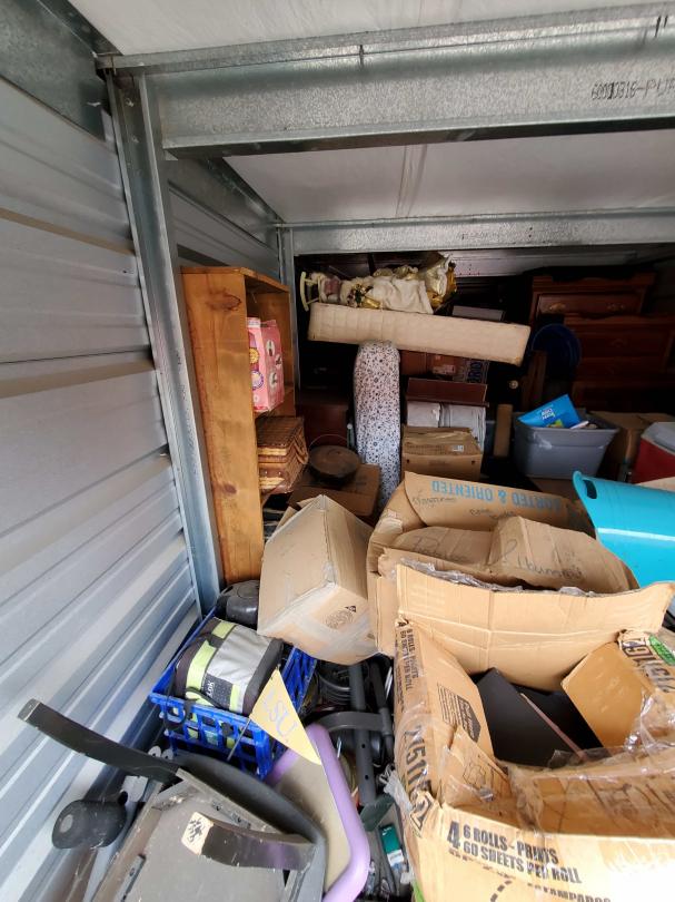 This unit appears to contain… Inventory: numerous misc boxes, scissor jack, weight bench, washing machine, portable space heater, chair, book shelf, mattress, boxspring, decor, chest of drawers x2, ice cooler, magazine rack,