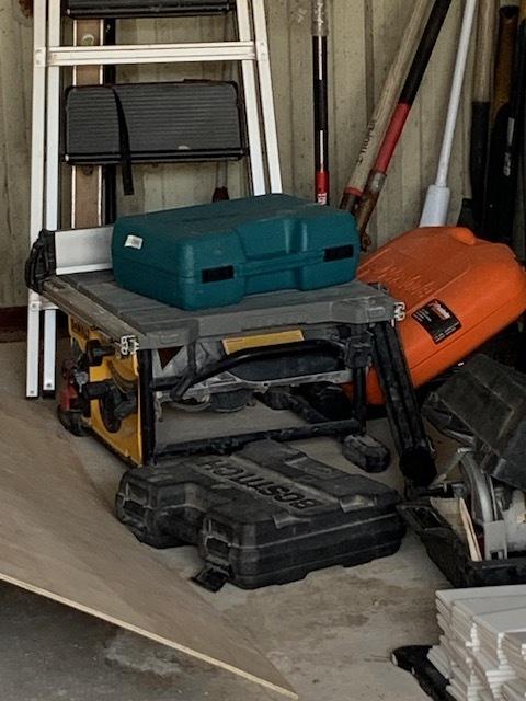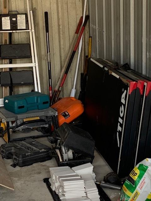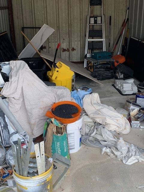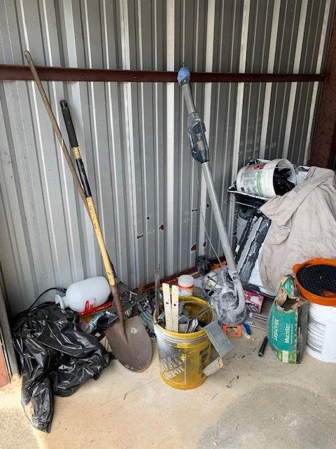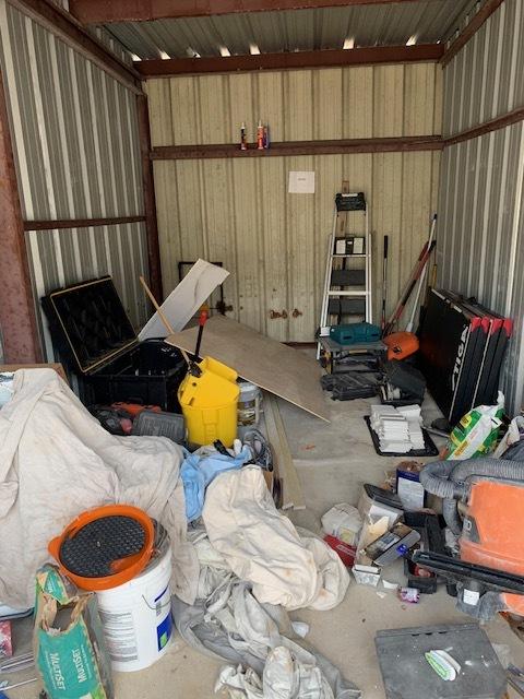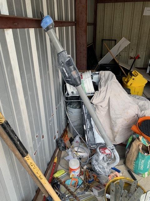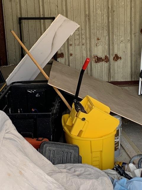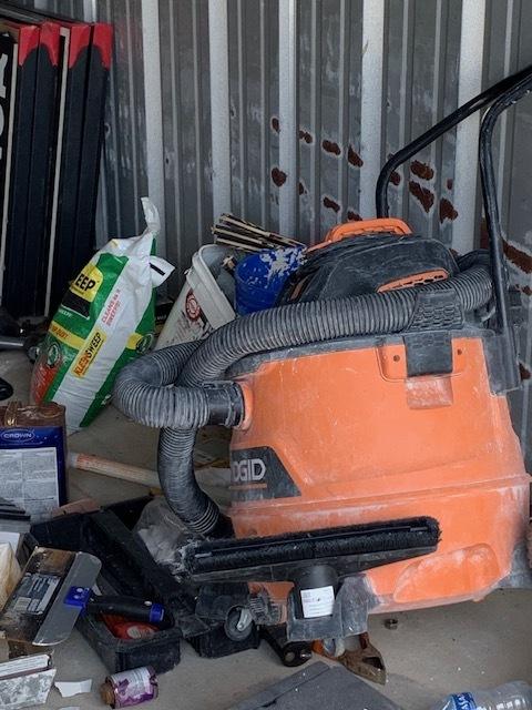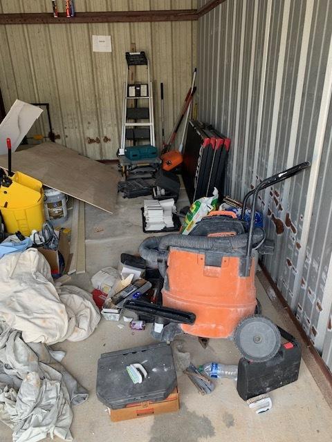 This unit appears to contain…Shop vac, tools, construction materials, ladder, containers
