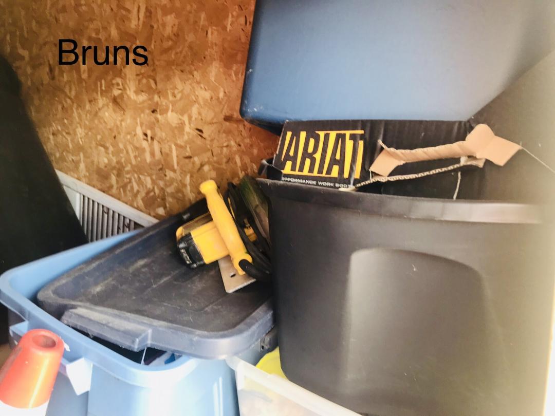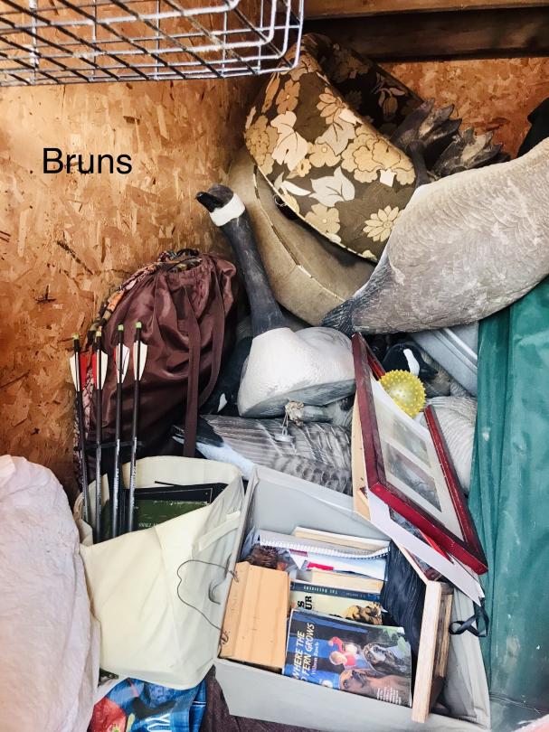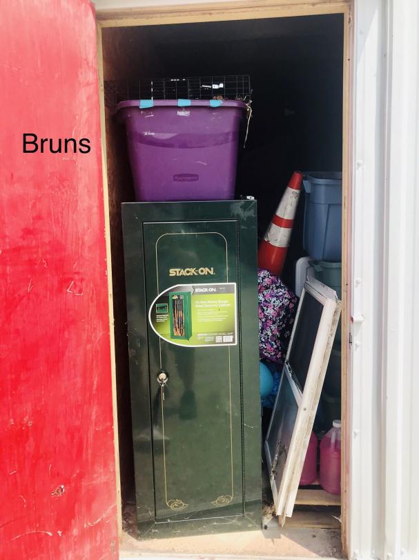 This unit appears to contain…Tools, hunting gear, Stack-on gun cabinet, cross bow, hunting blind, full body goose decoys (possibly Big Foot decoys), floater goose decoy, furniture, punching bag, boot dryer.