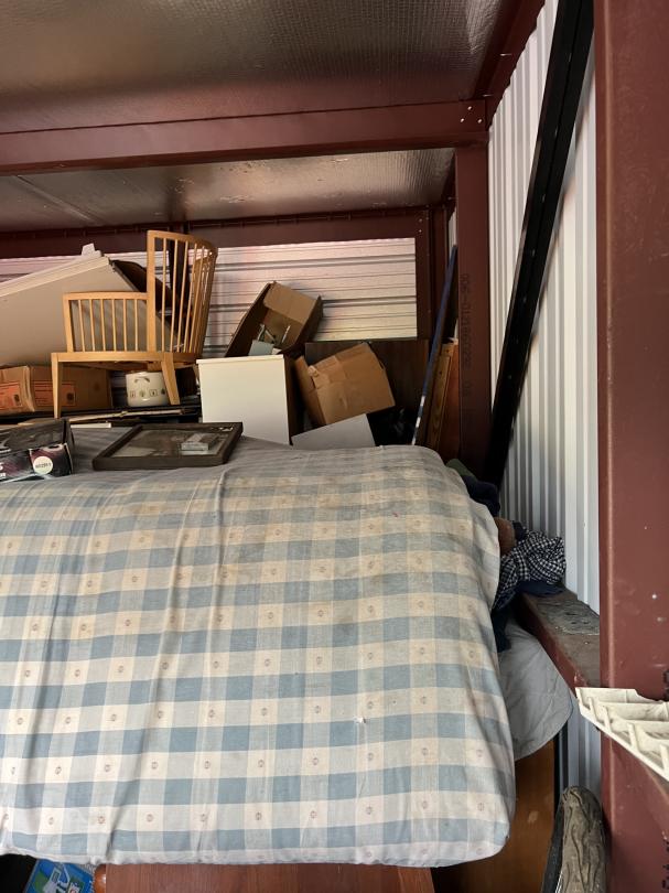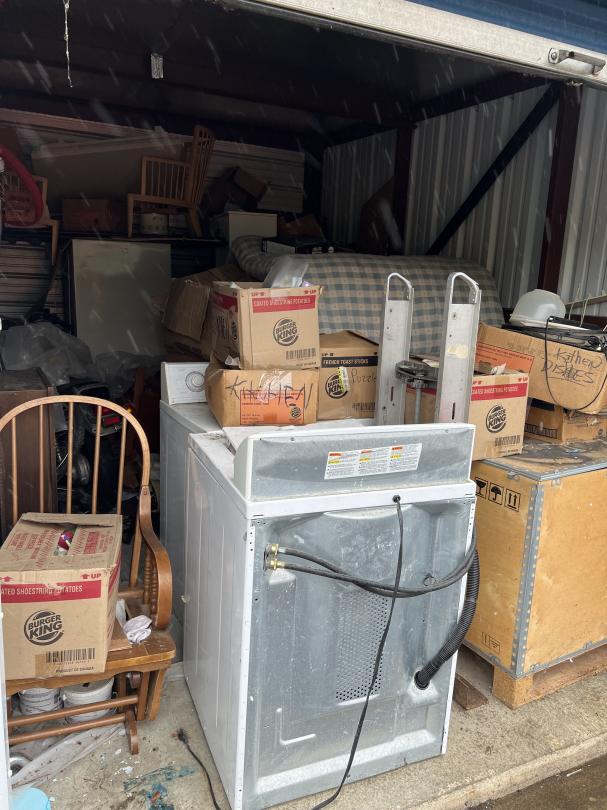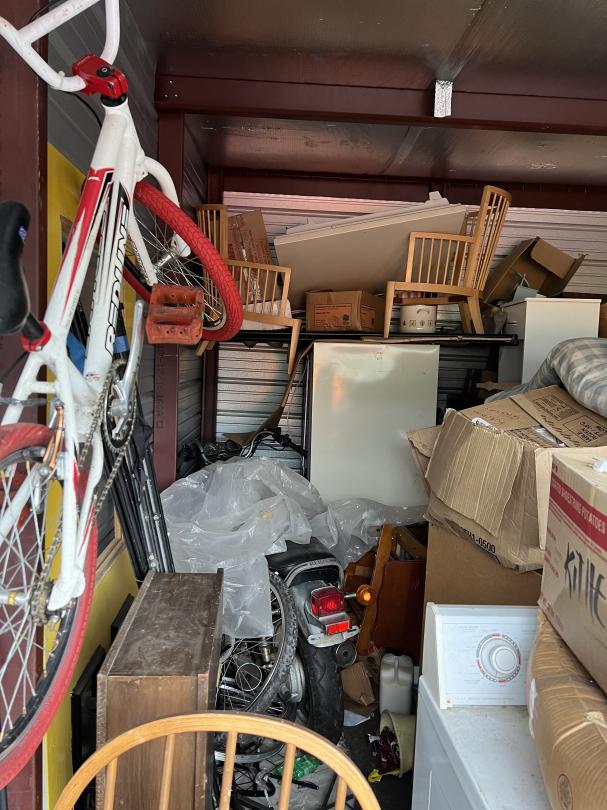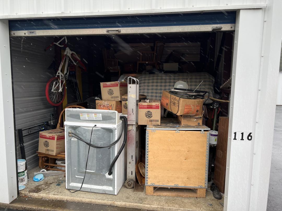 This unit appears to contain…This unit is a 10x15. Packed with lots of household good that include bikes, washer and dryer, freezer, motorcycle, chairs, mattress and much more.