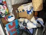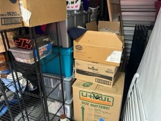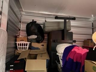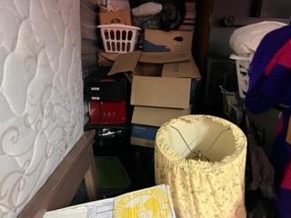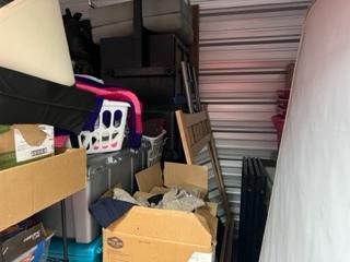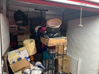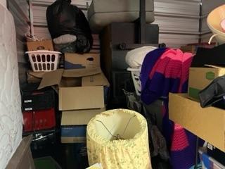 This unit appears to contain…Chest Freezer, Mattress, Box Springs, Bed Frames, Shelves, Cart, Tv's, Totes, Boxes, Table, Bags.