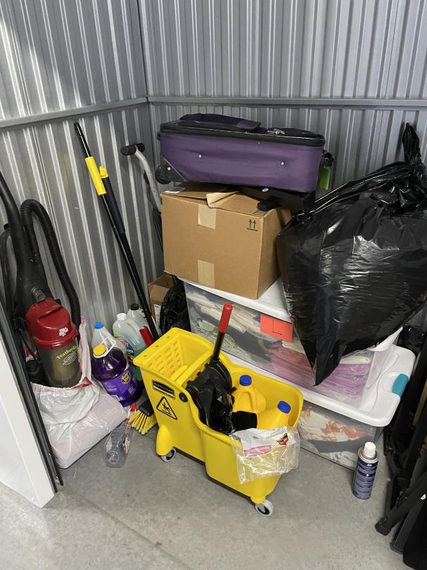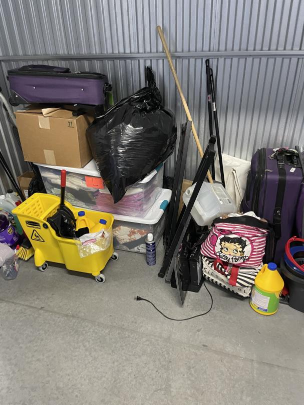 This unit appears to contain…Suite cases, totes, bags, cleaning supplies.
