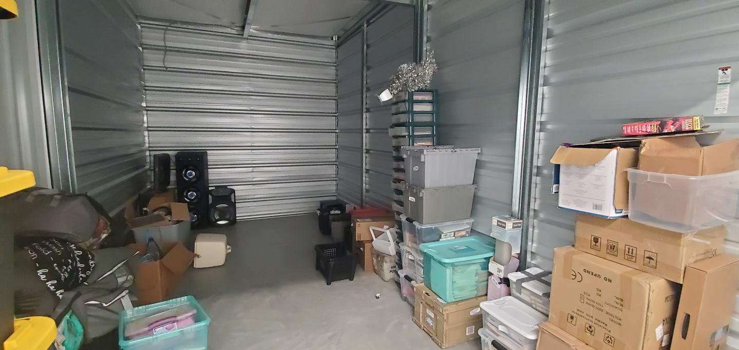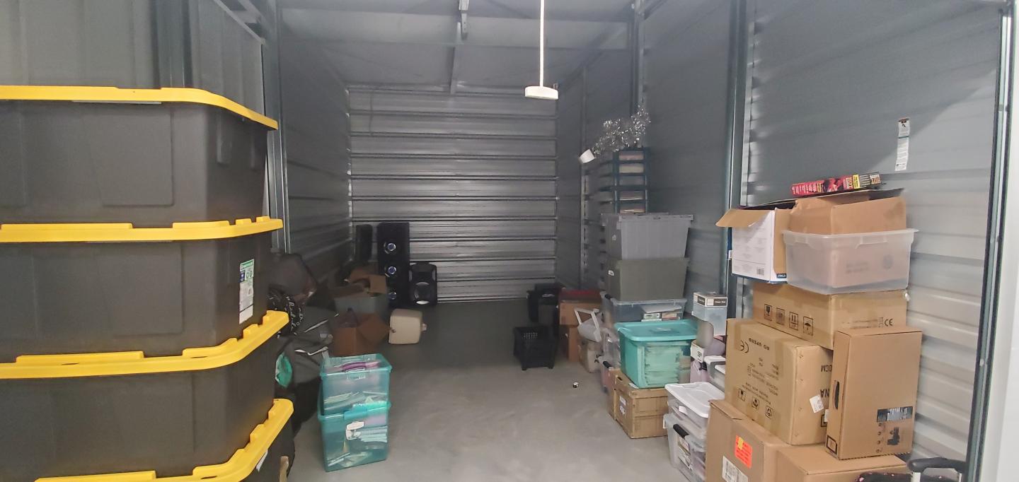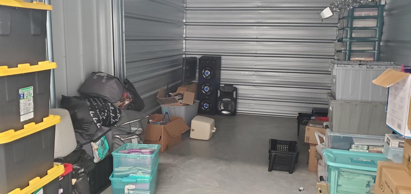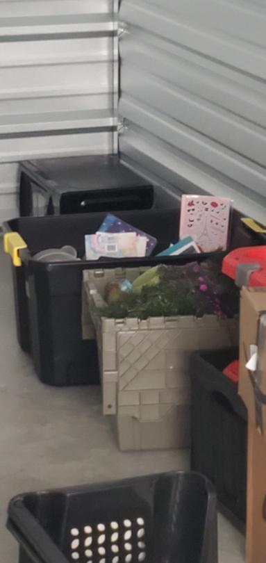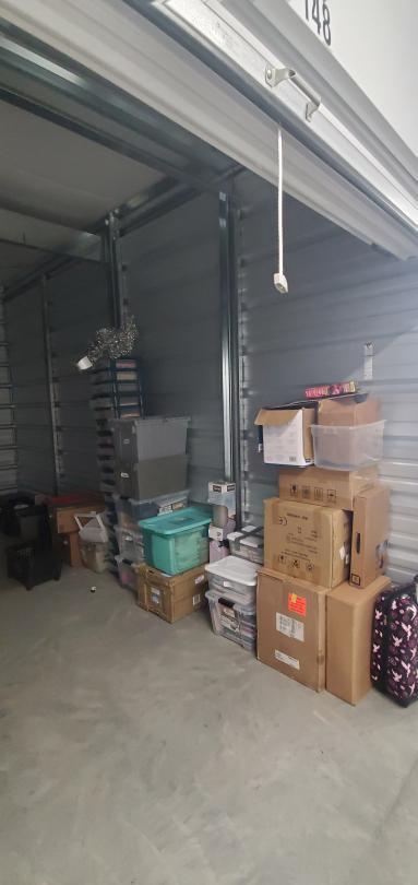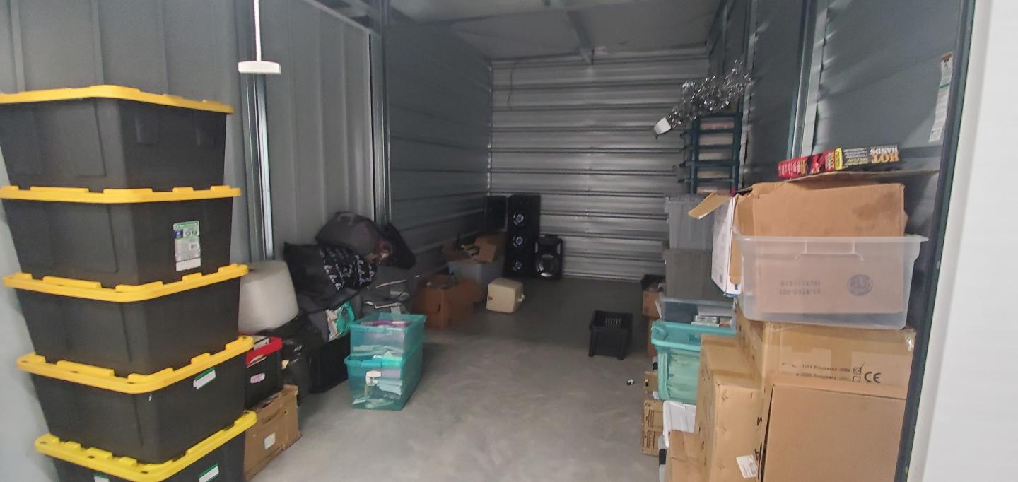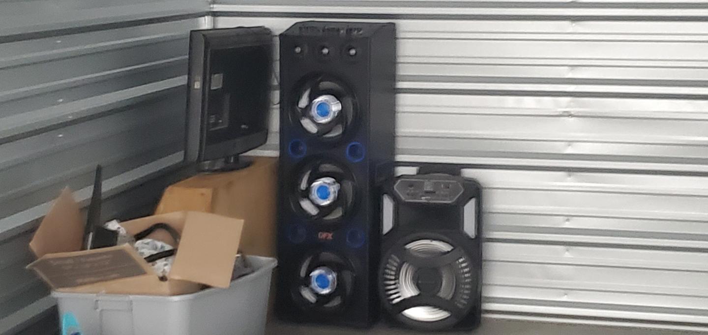 This unit appears to contain…This unit appears to contain...a suitcase, speakers, 36" flat screen television, several plastic totes, several boxes, clothes, a microwave, an office chair mat, a roll of bubble wrap, at least one box of Christmas ornaments, and books.