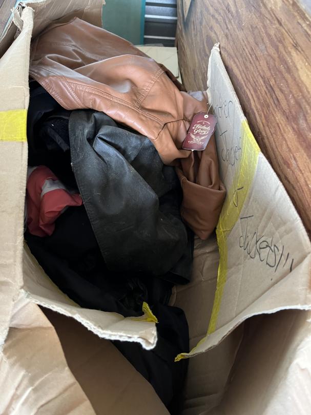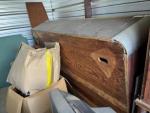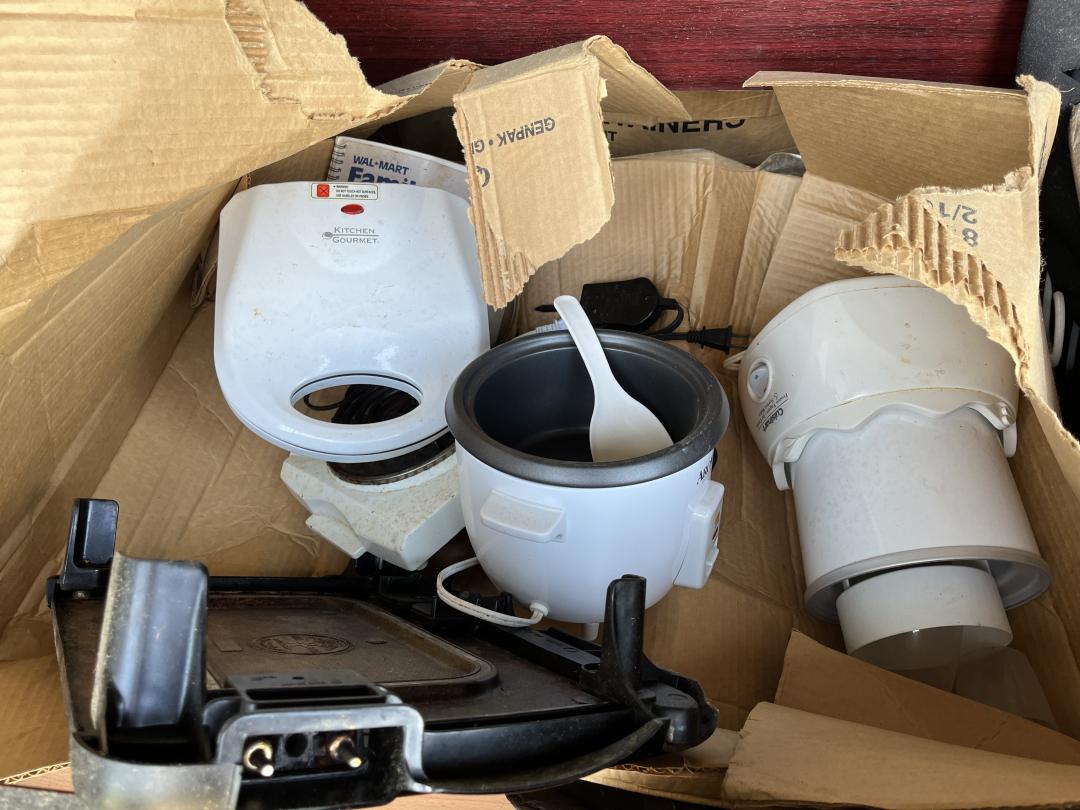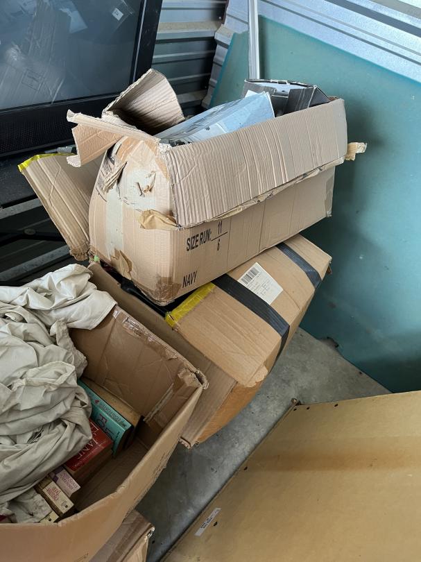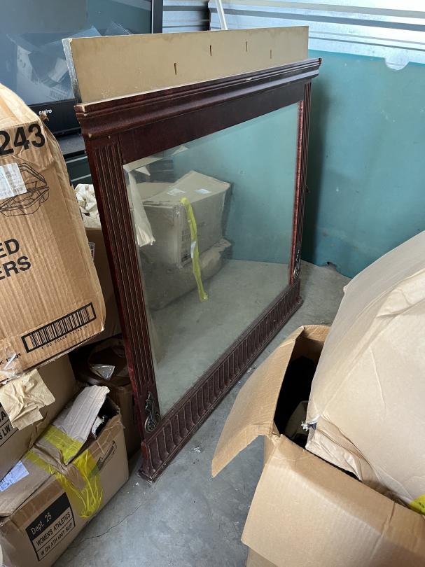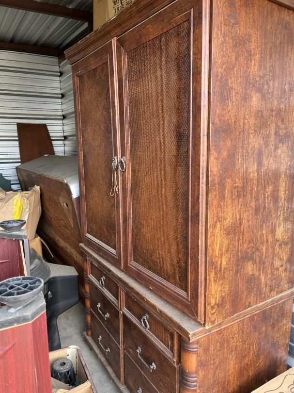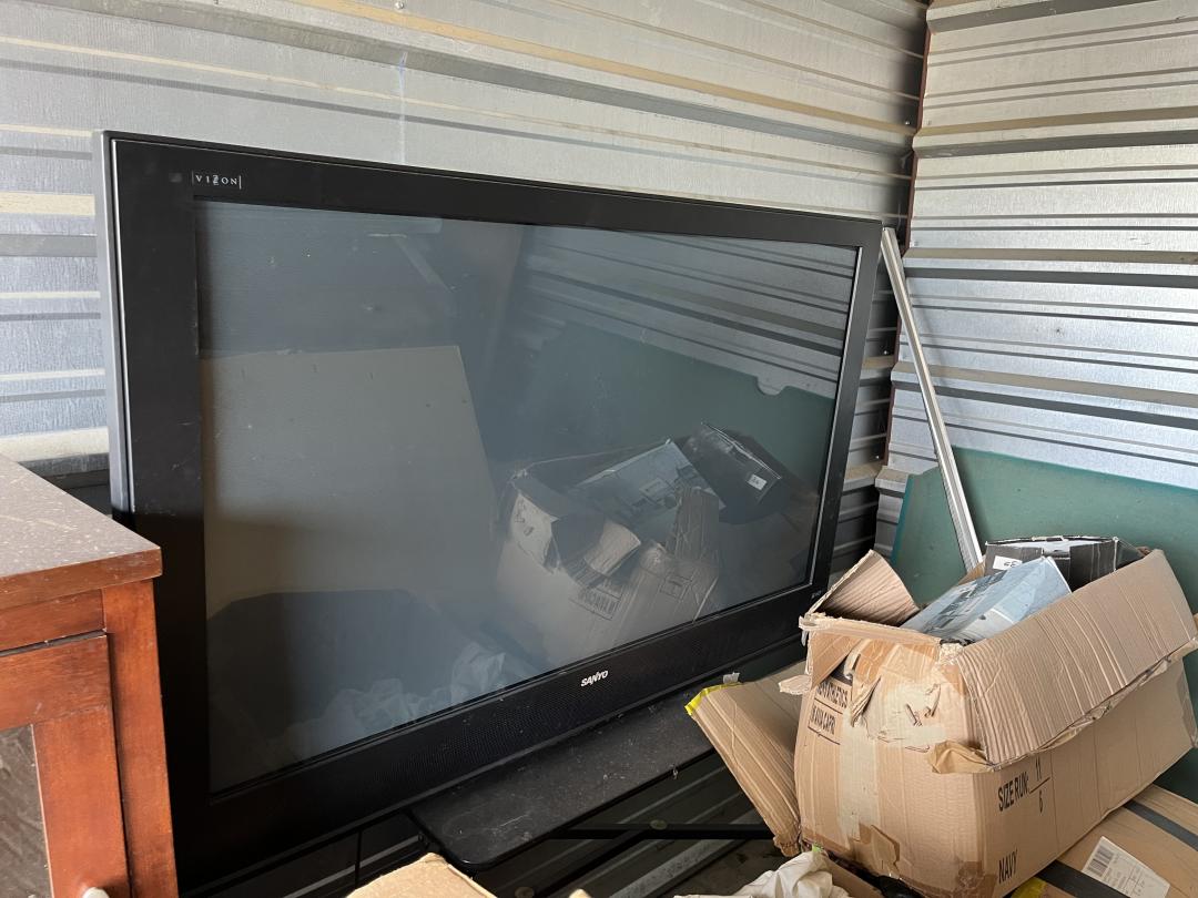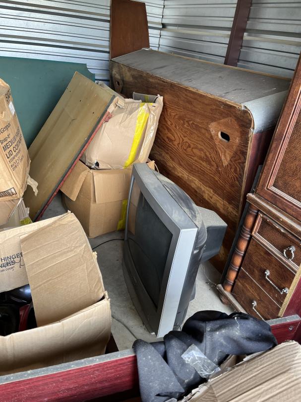 This unit appears to contain…Frozen yogurt machine, electric skillet, large armoire with the drawers, TV, glass cabinet, Sanyo flatscreen TV, leather jackets books what appears to be a pool table mirror lots of boxes with contents glasses