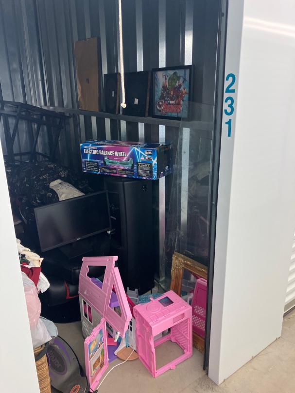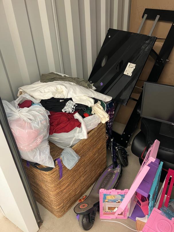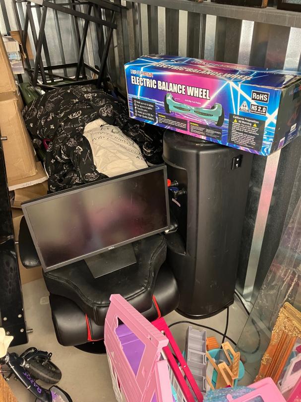 This unit appears to contain…Clothes, bins, boxes, computer monitor, razor scooter, hovercraft, water cooler, pictures etc