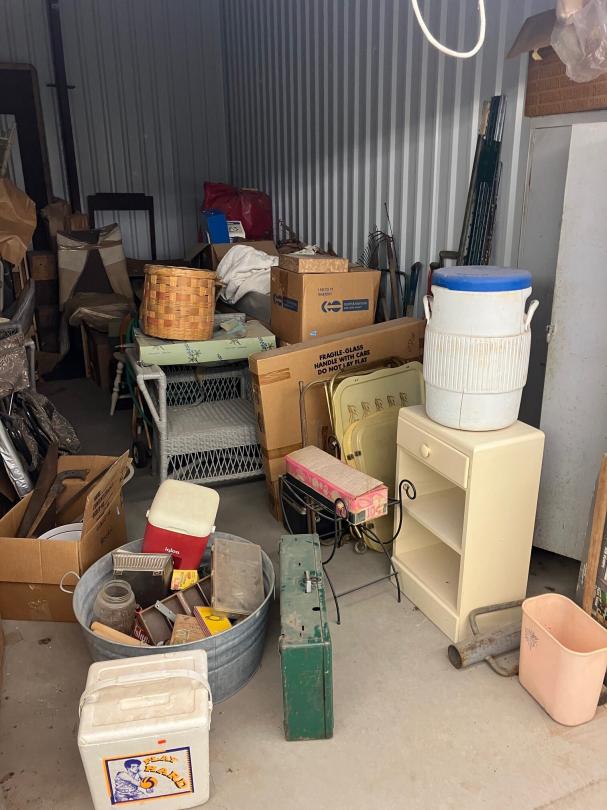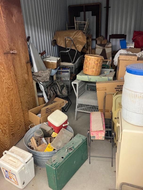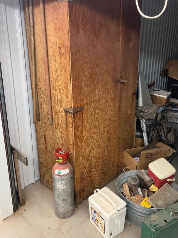 This unit appears to contain…Cabinents, fishing gear, camping gear, tables, tools