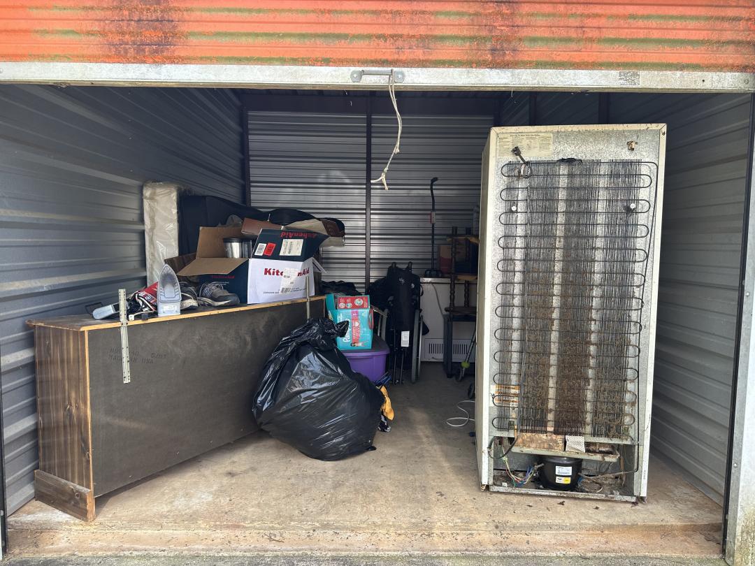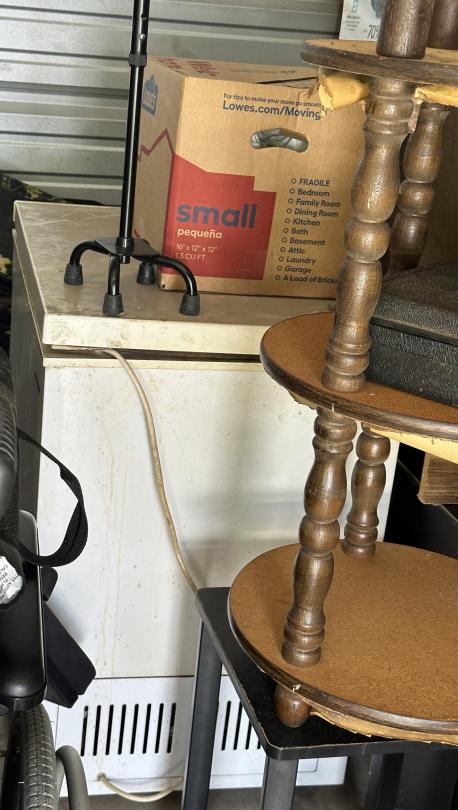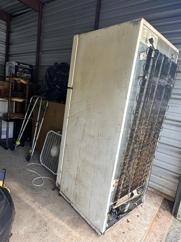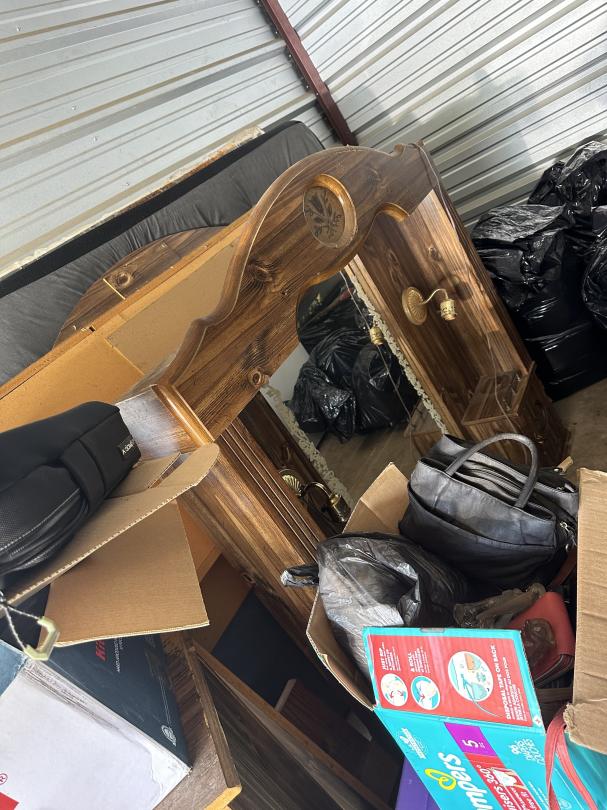 This unit appears to contain…Bedroom suit Mattress Bed frame with mirror on head board Ninja coffee maker Box fan Refrigerator/ freeze deep freezer Wheelchair Walker Air fryer Night stand End tables Boxes Bags Household items