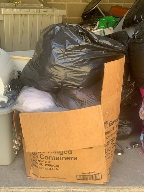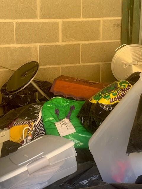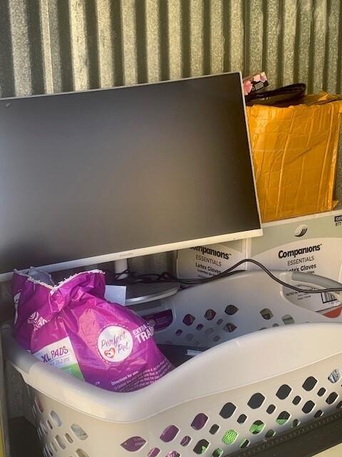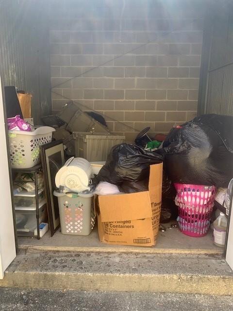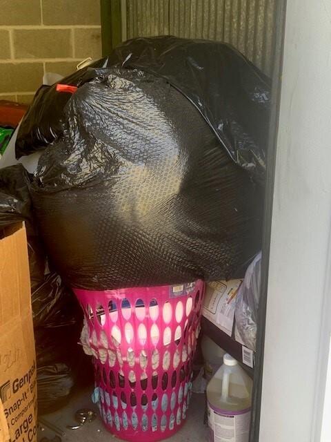 This unit appears to contain…BAGS, BOXES, LAUNDRY BASKET, PICTURES, CRATES, CLEANING SUPPLIES, POT, HOUSEHOLD GOODS, SAMSUNG MONITOR