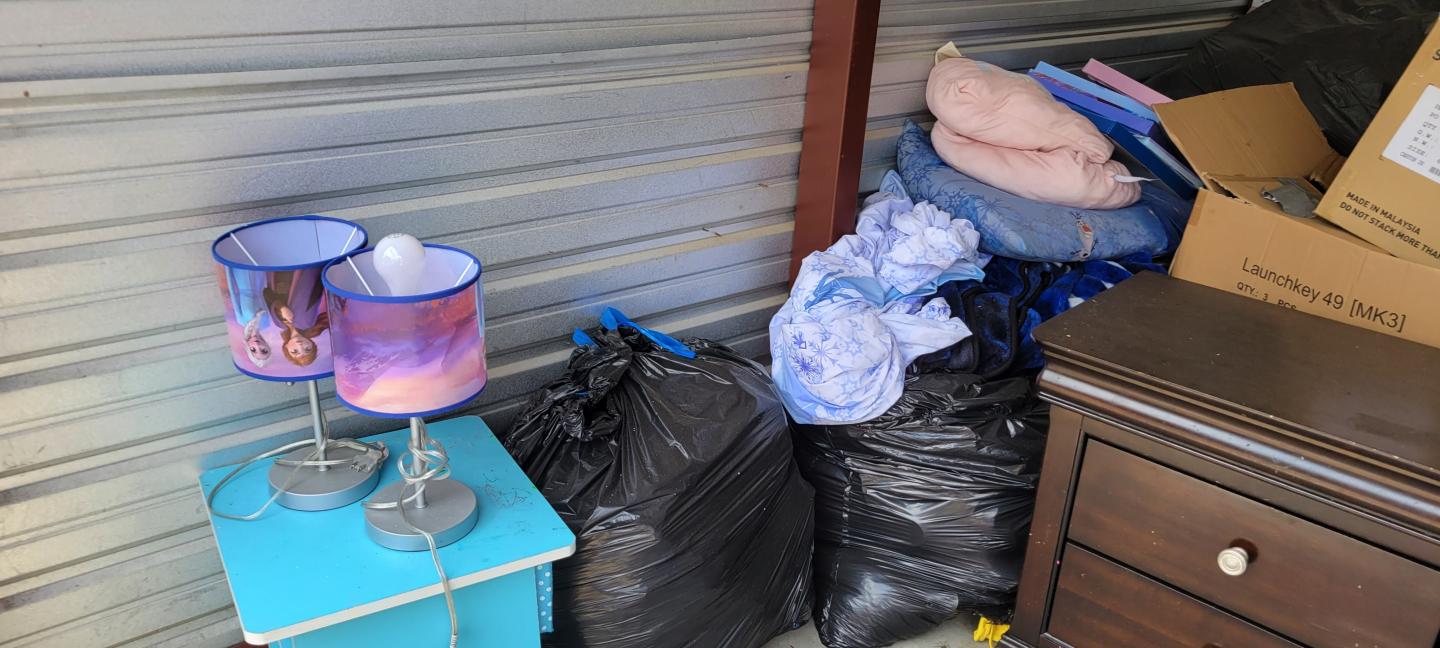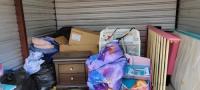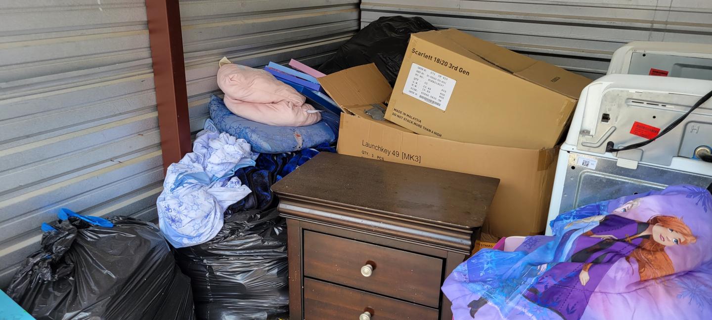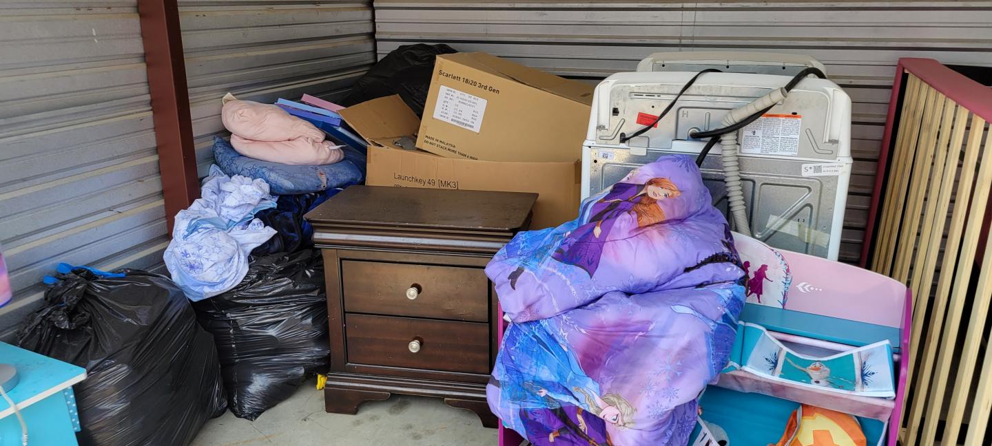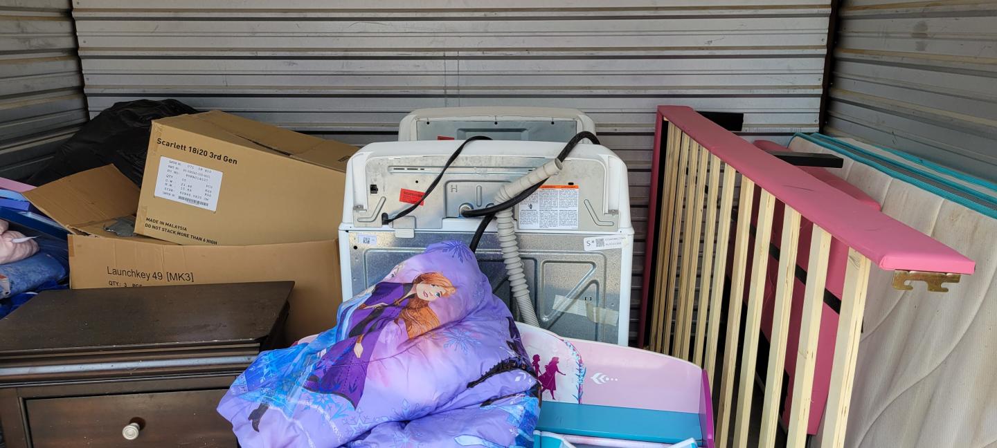 This unit appears to contain…Washing Machine,Dryer,Mattresses,Lamps,Plastic Bags,Misc. Boxes,Misc. Items