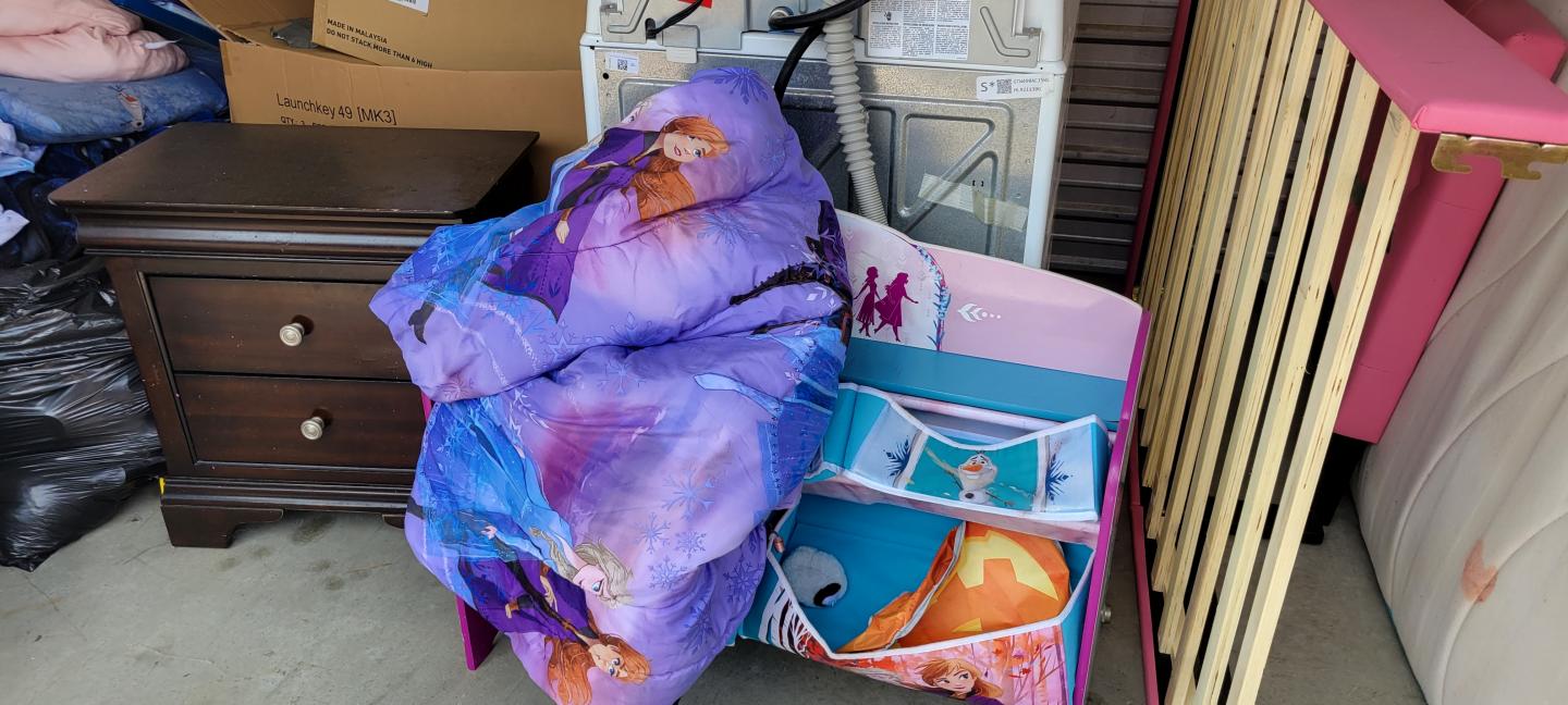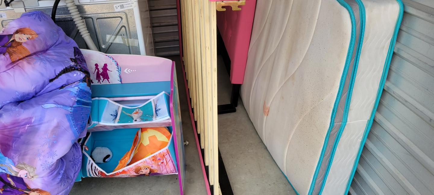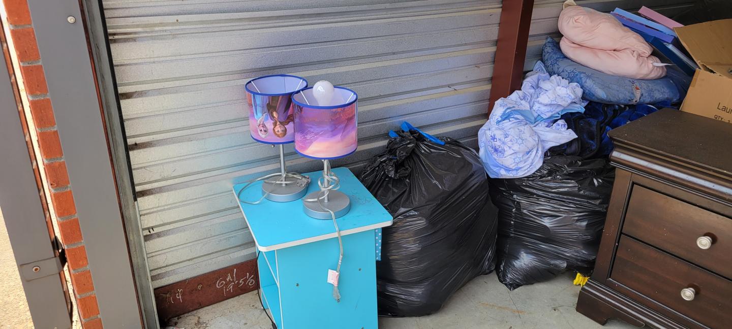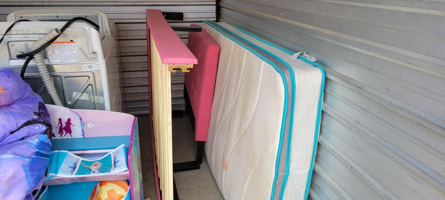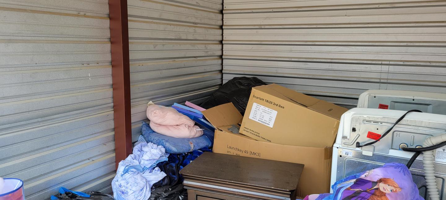 This unit appears to contain…Washing Machine,Dryer,Mattresses,Lamps,Plastic Bags,Misc. Boxes,Misc. Items