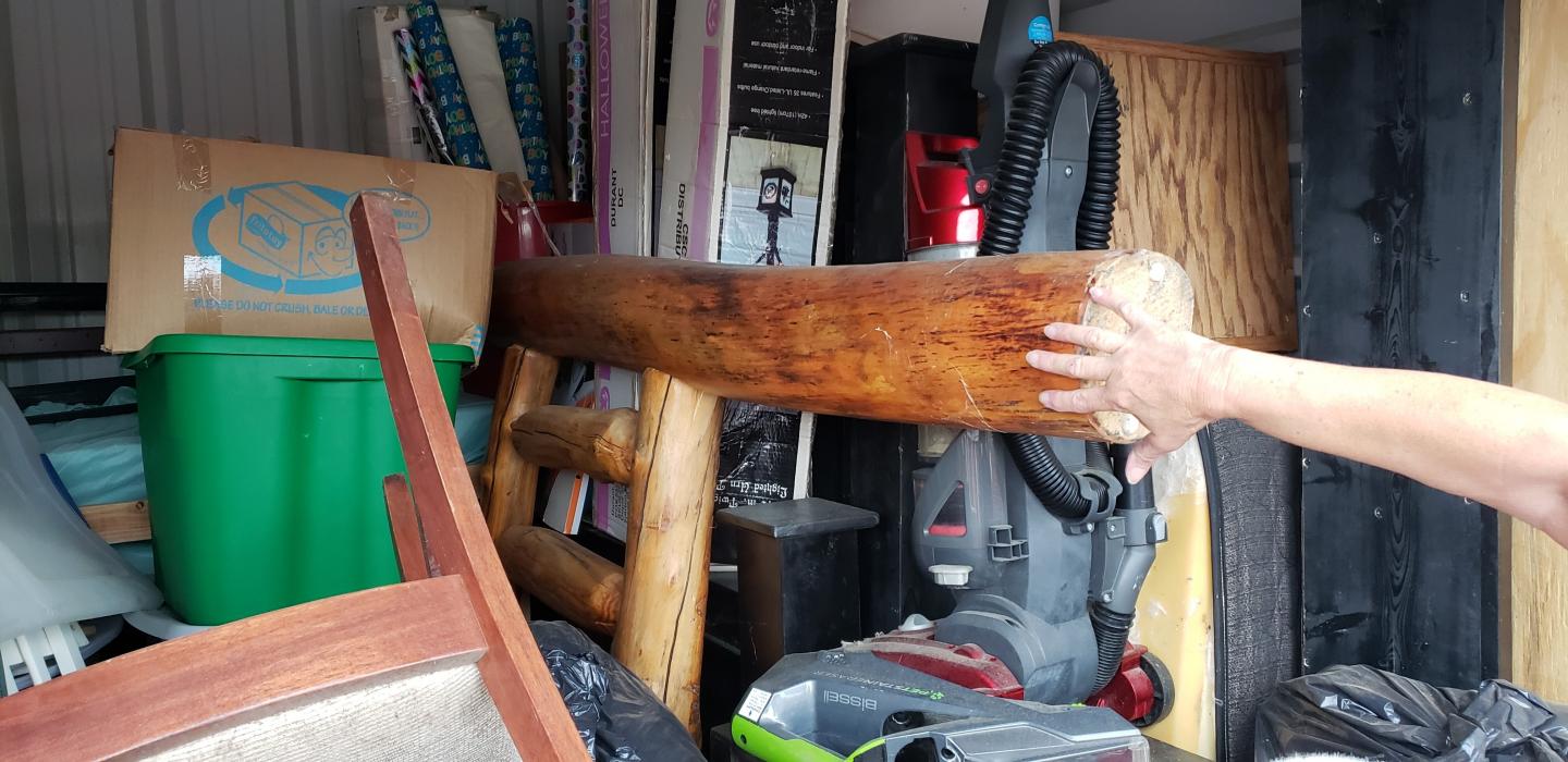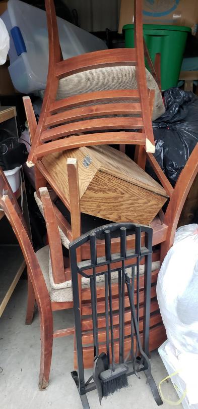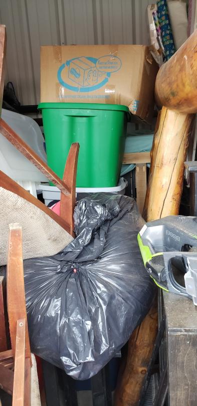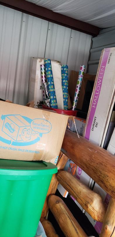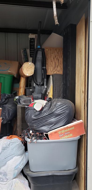 This unit appears to contain…This unit appears to have 2 headboards, fireplace set, vacuum cleaner, assorted home furnishings, and assorted totes