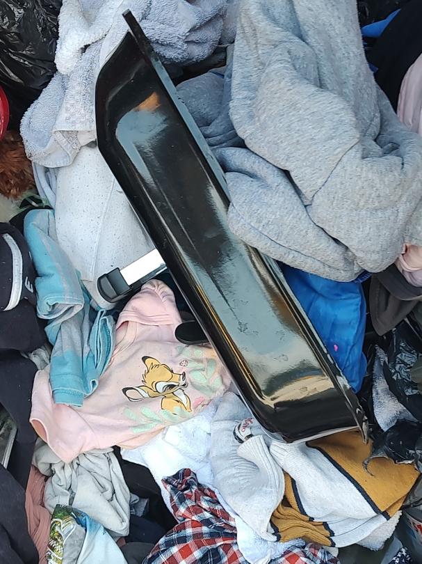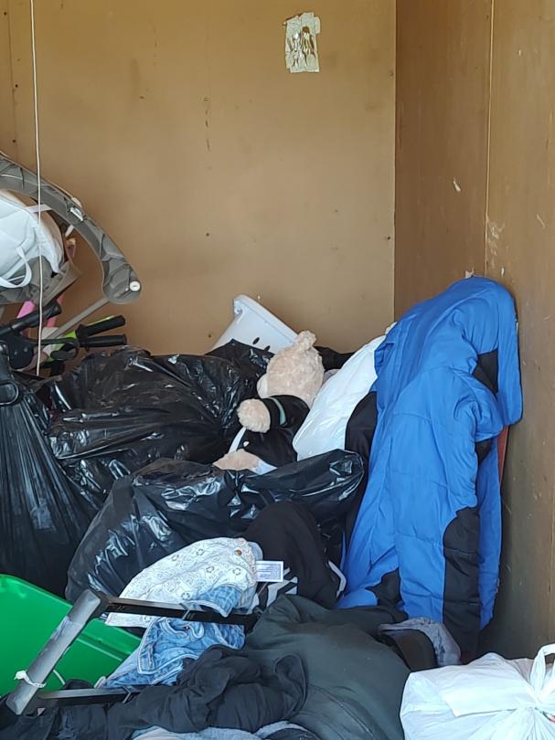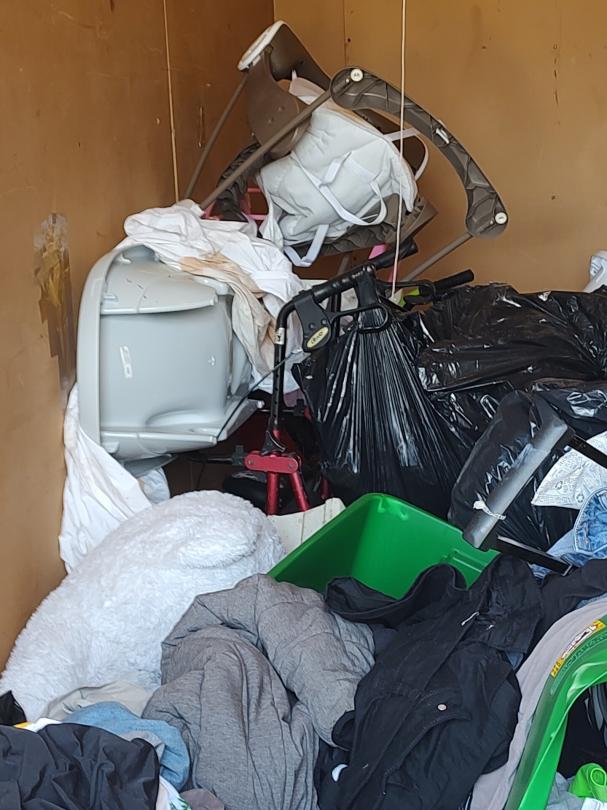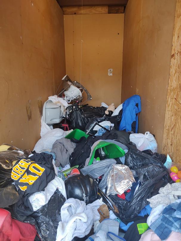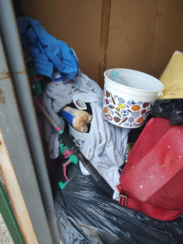 This unit appears to contain…This unit appears to contain a helmet, totes, fishing pole, plastic bags, clothing, toys and miscellaneous items.