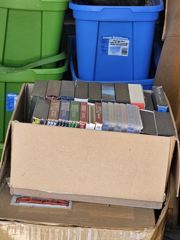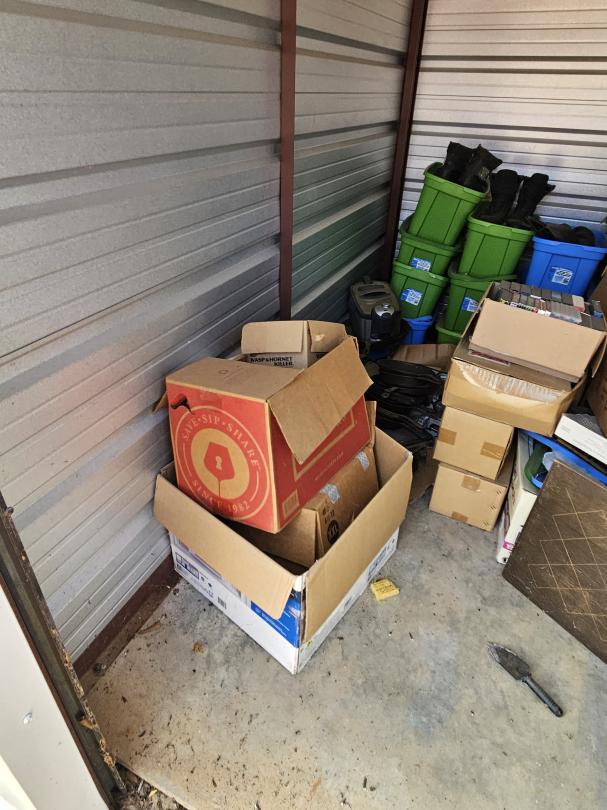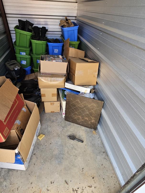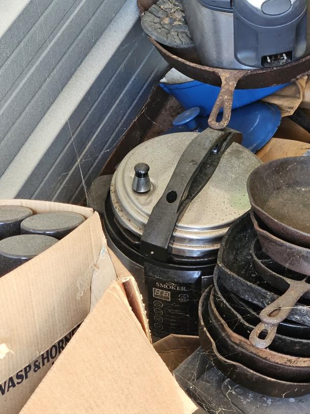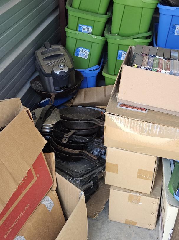 This unit appears to contain…Boxes, totes, pressure cooker. deep fryer, black iron skillets, boots, VHS tapes