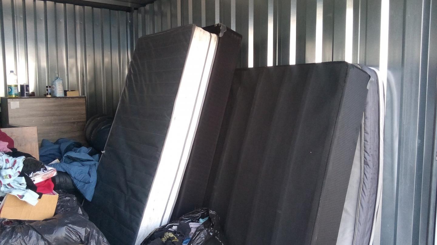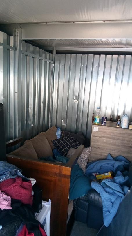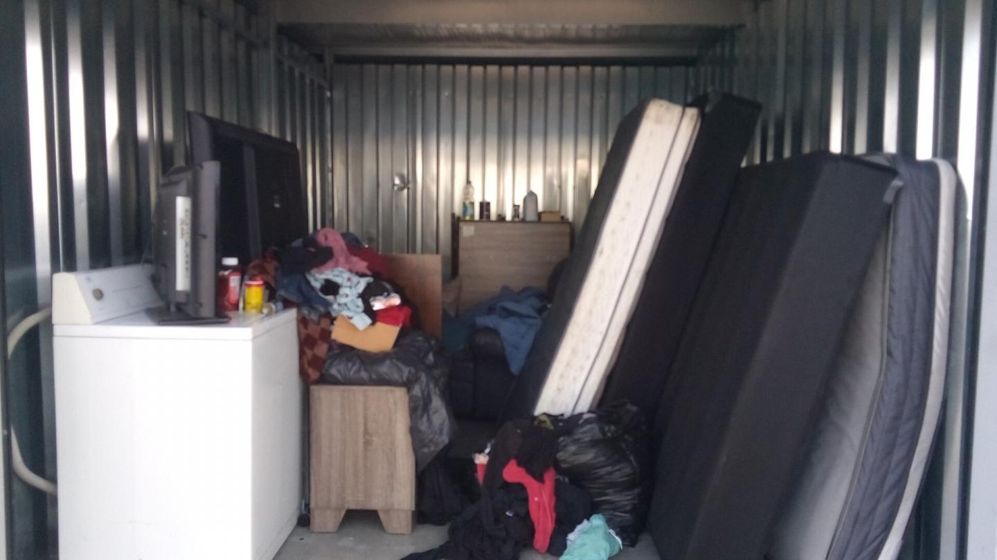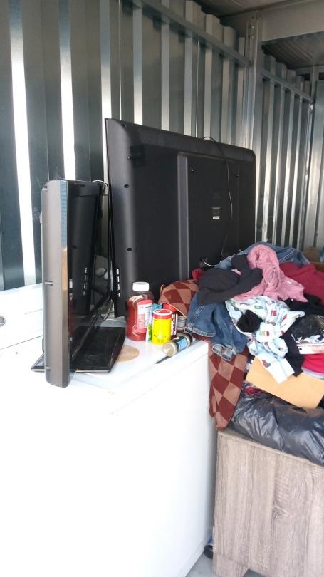 This unit appears to contain… washing machine, dryer, TV, couches, mattress, box springs, dresser,nighstands, chairs, table, plasticbags, clothing, miscellaneous items