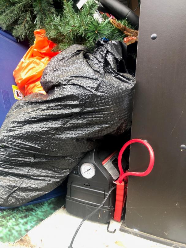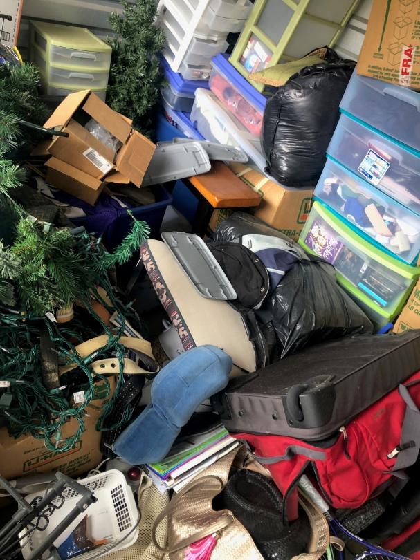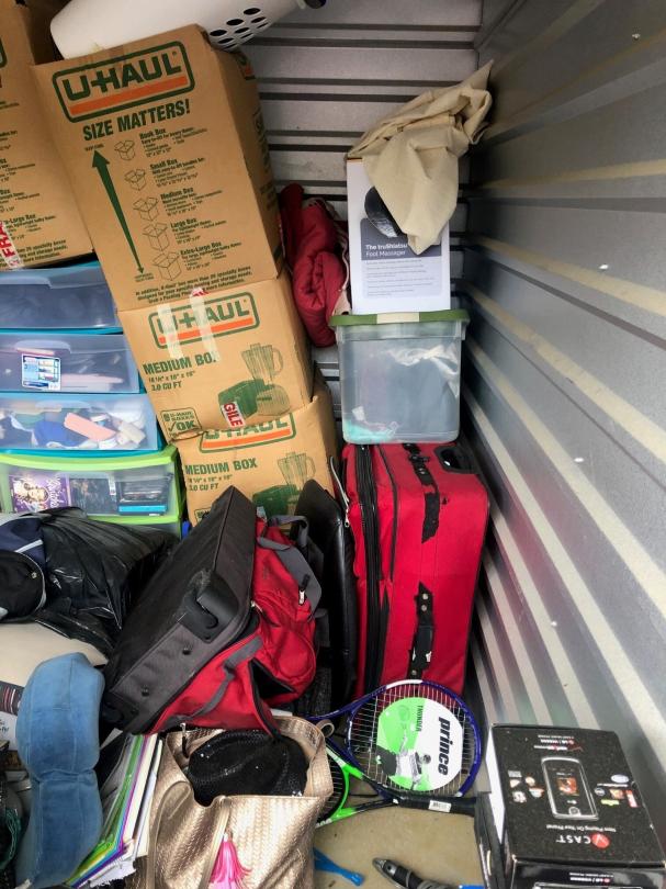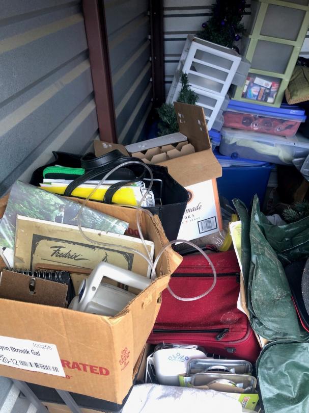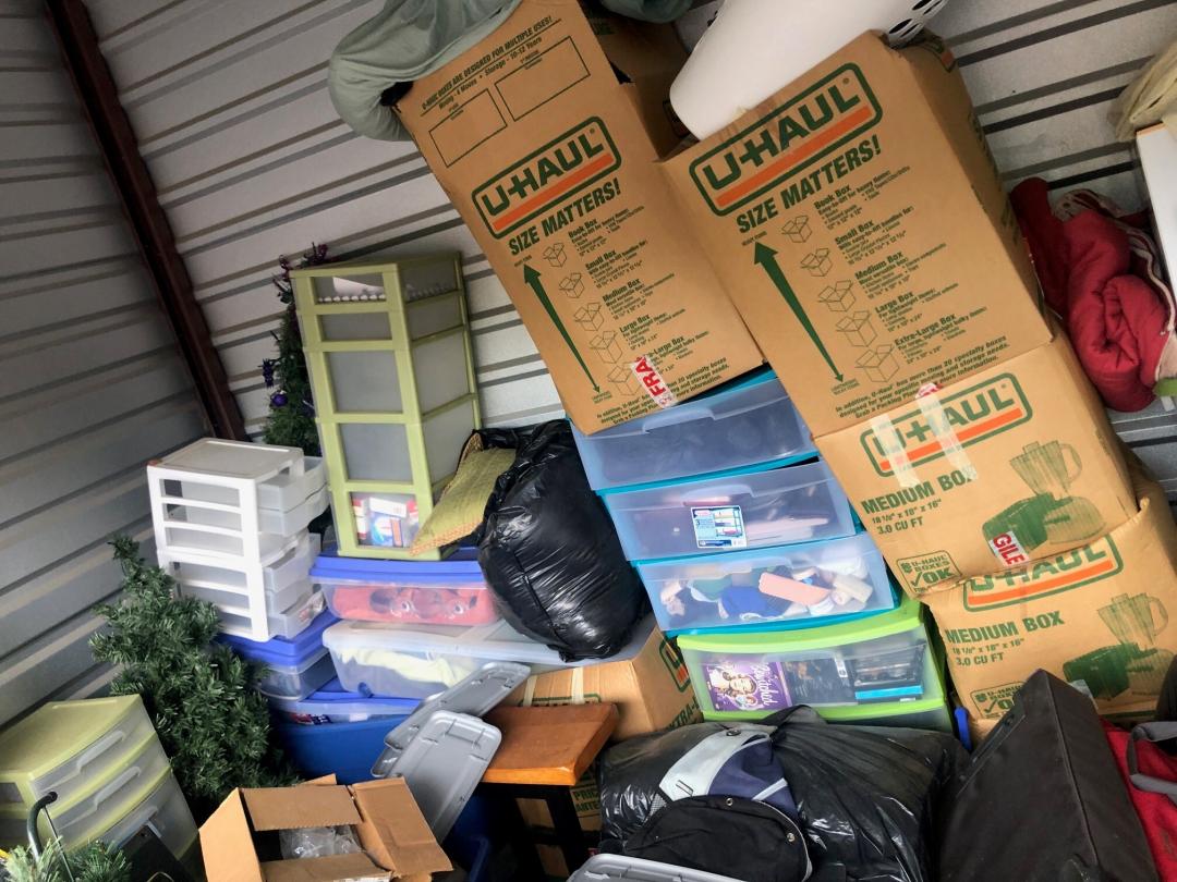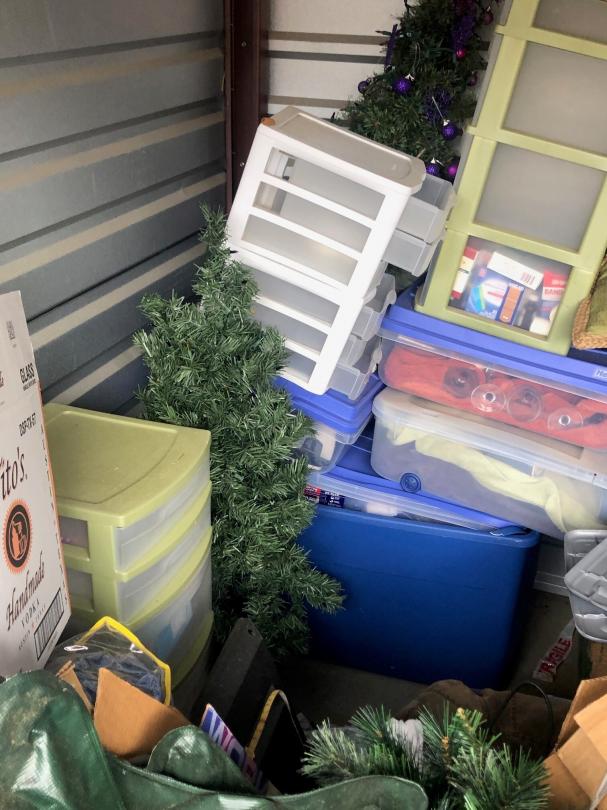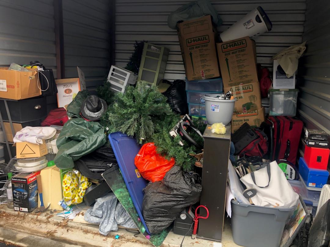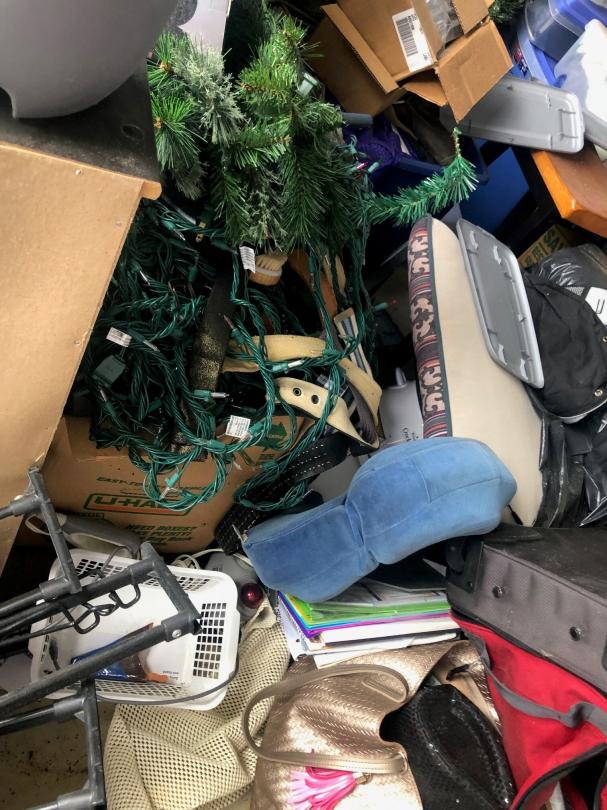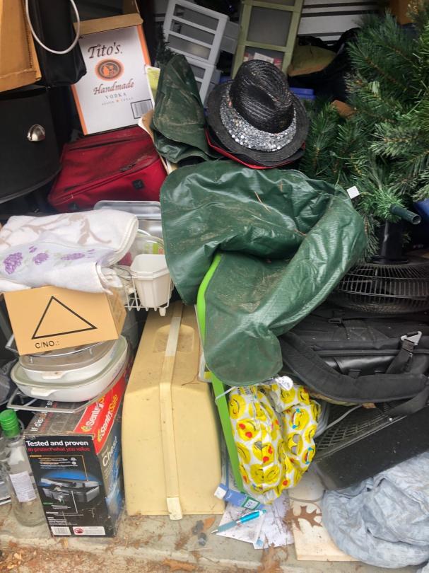 This unit appears to contain…Lamps, Plastic Containers, Misc. Boxes, Misc. Household Items, Plastic Bags, Portable Battery Charger, Laundry Baskets, Misc. Items, Fans, Hammer, Holiday Decorations