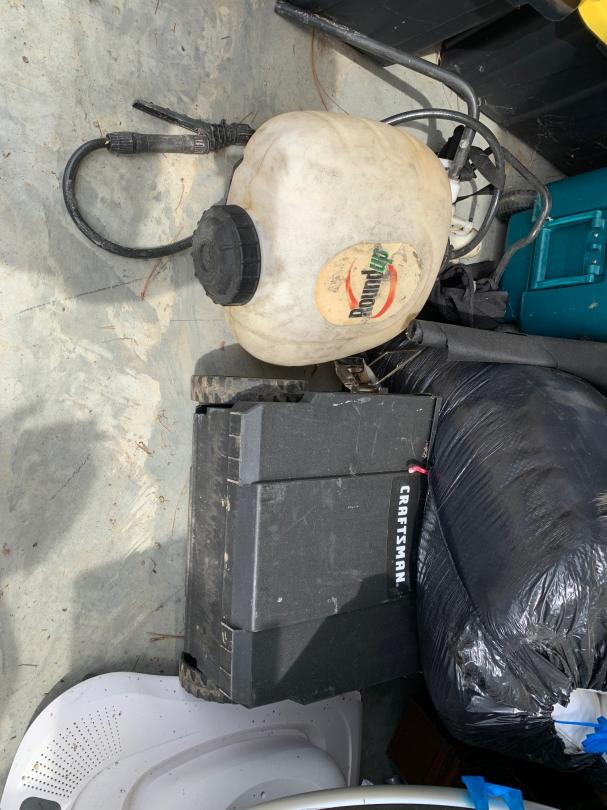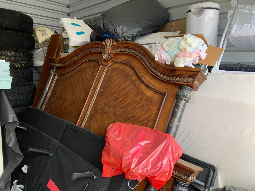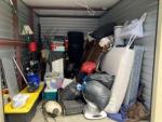 This unit appears to contain…baby items, mattresses, trash can, head board, bags, tiller, r battery, lamp, totes, tires, shoe boxes, sprayer, ice chest, folding chair, nightstand, dresser, hangers, futon, craftsman box, rugs, mirror, drying racks, deer corn, gas can