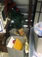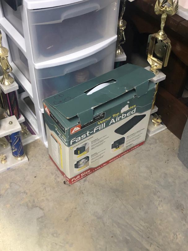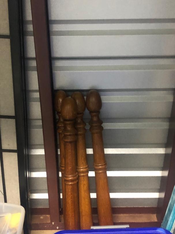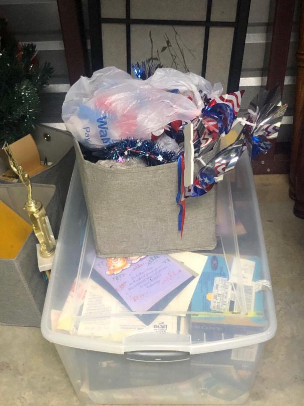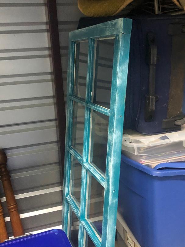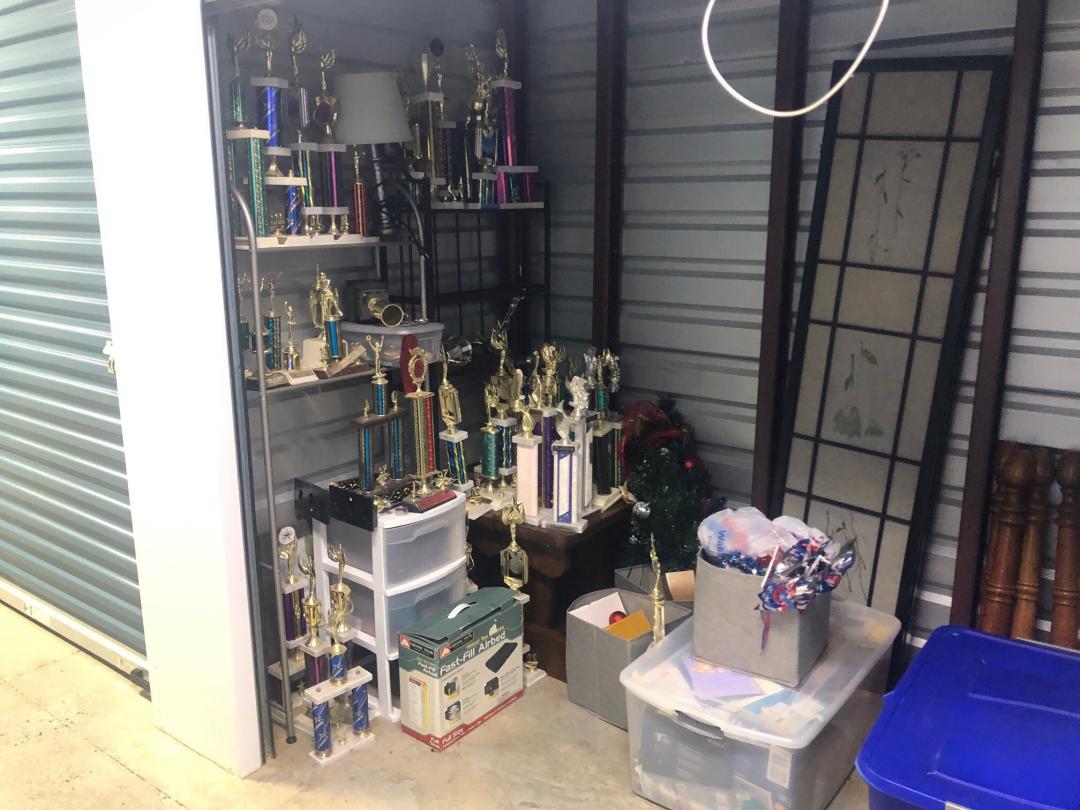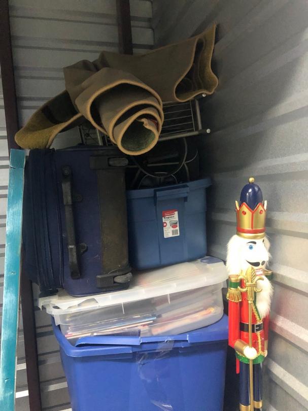 This unit appears to contain… Lamp, Plastic Containers, Trophies, Room Divider, Old Window, Suit Cases, Holiday Decor, Metal Shelving, End Table, Box of CDs, Wooden Table Legs, Rug