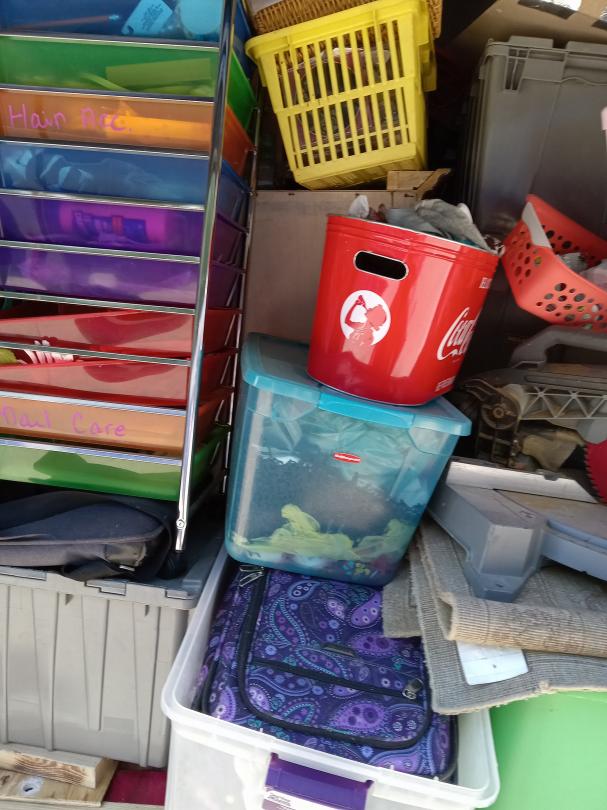 This unit appears to contain…Drive-Up Storage this unit is packed. small playboy collection. 80s skill saw rigid table saw. handcuffs plastic totes and drawers kids golf bag kids stuff building materials and table,