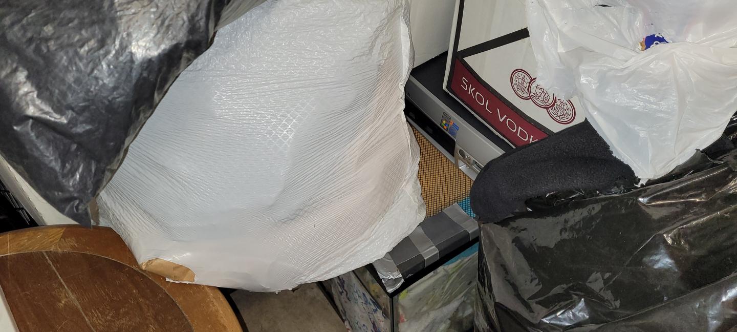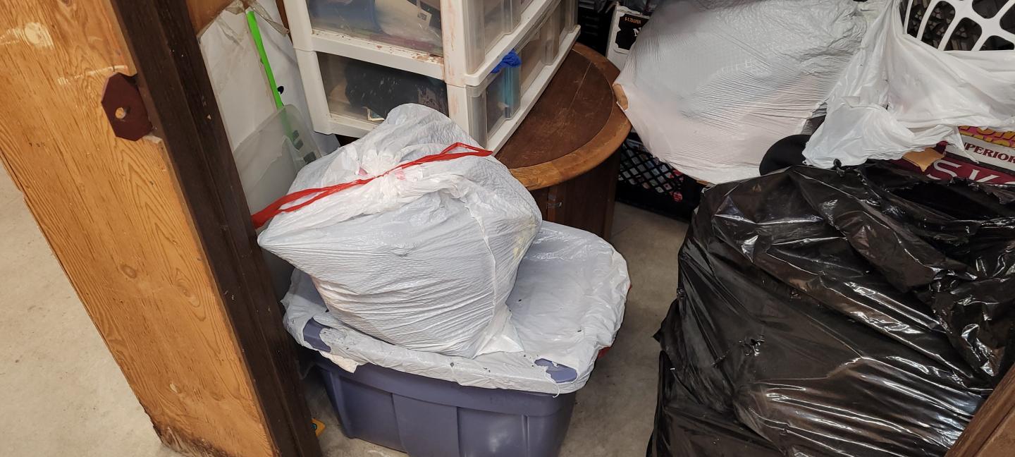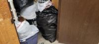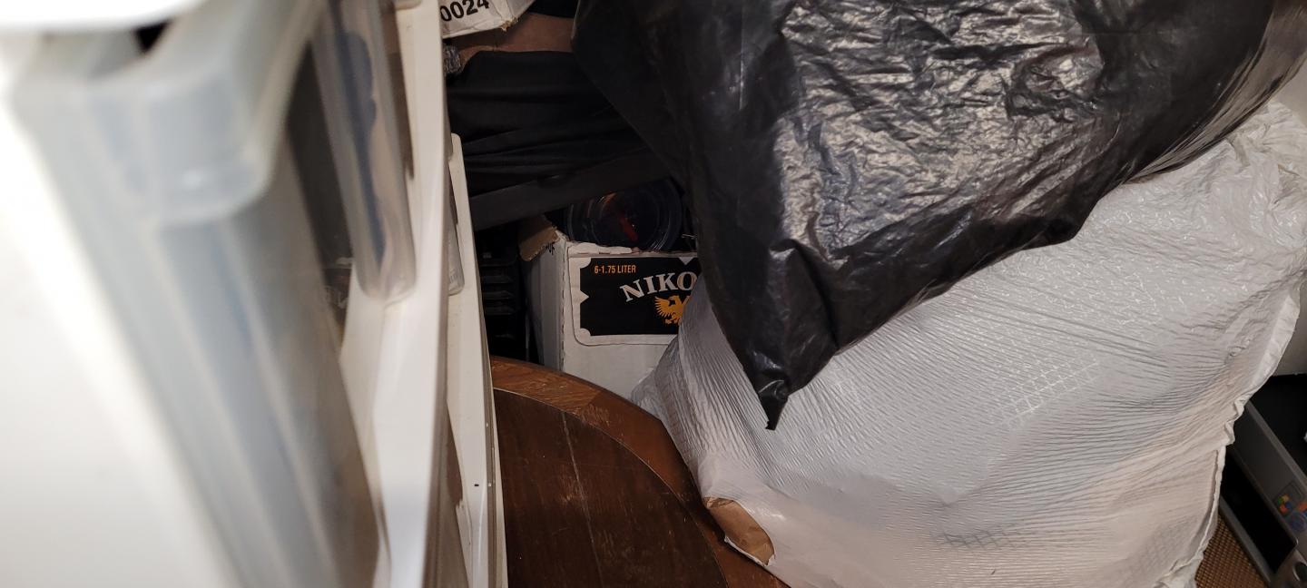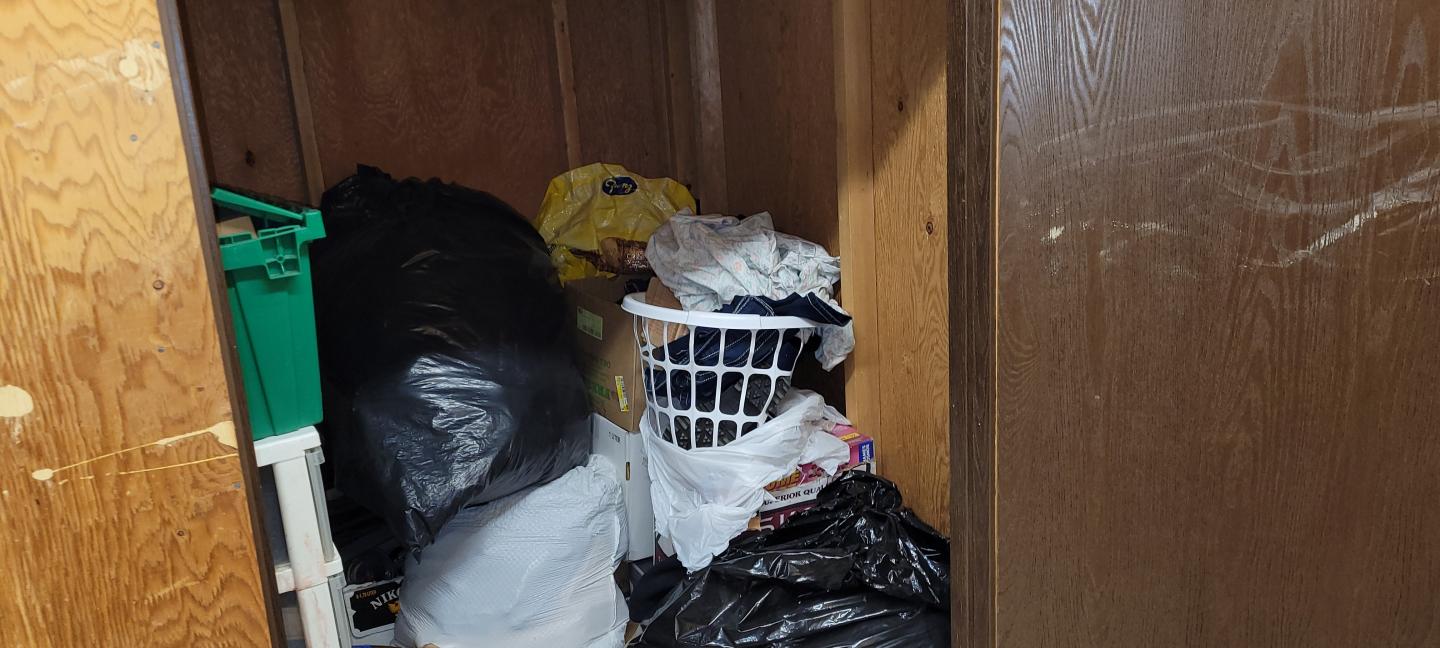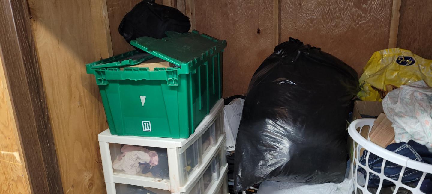This unit appears to contain…boxes, bags, totes, clothes, boots, table