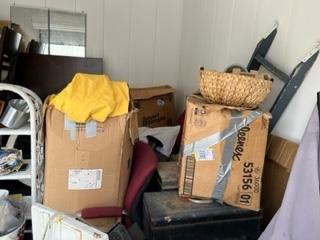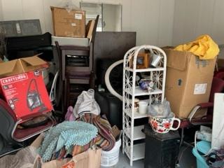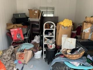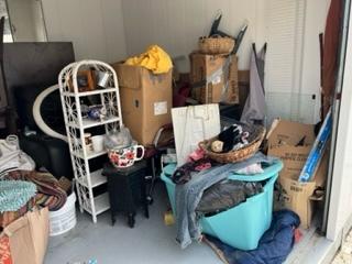 This unit appears to contain…Toolbox, tools, couches, shelving, nightstands, lamps, chairs, tables, kitchenware, decor, plastic bags, plastic containers, misc boxes, clothing, sports gear, suitcases