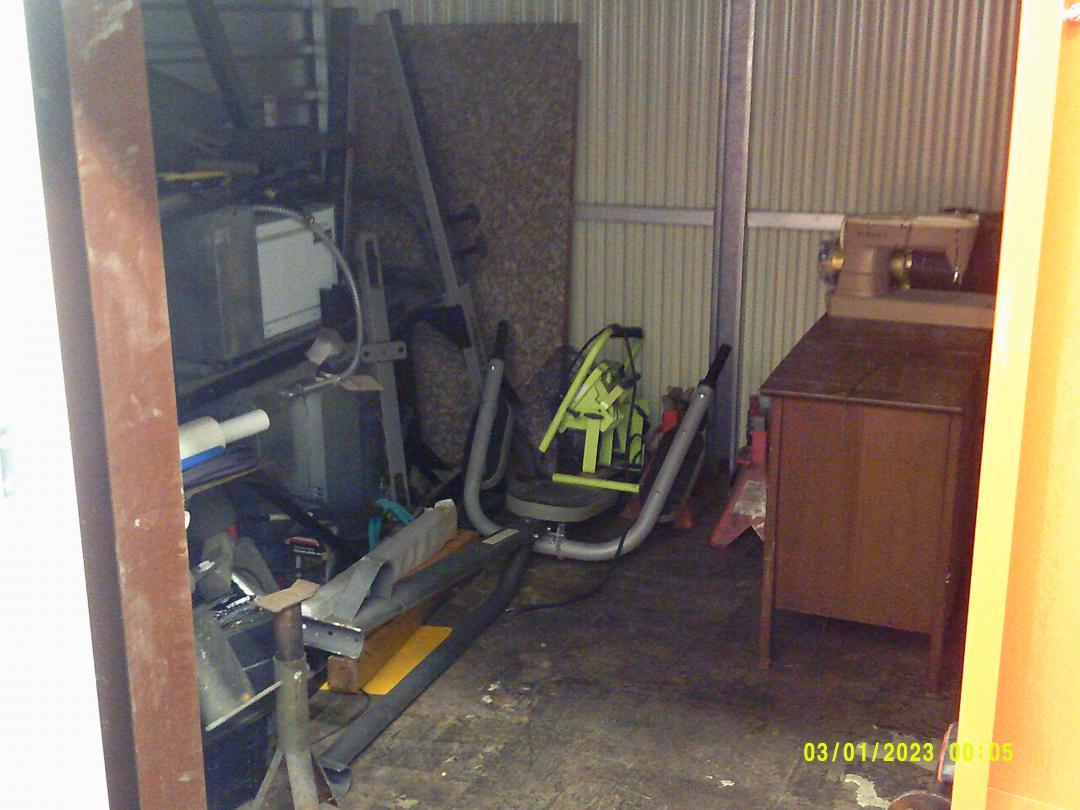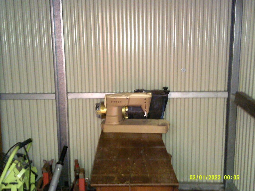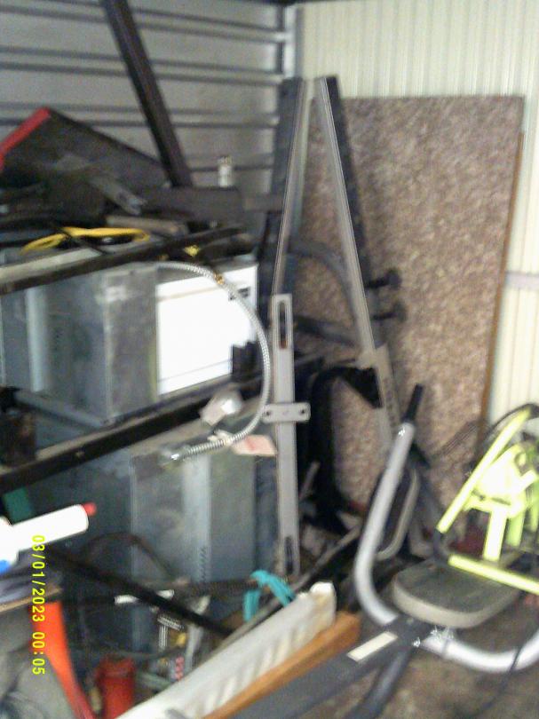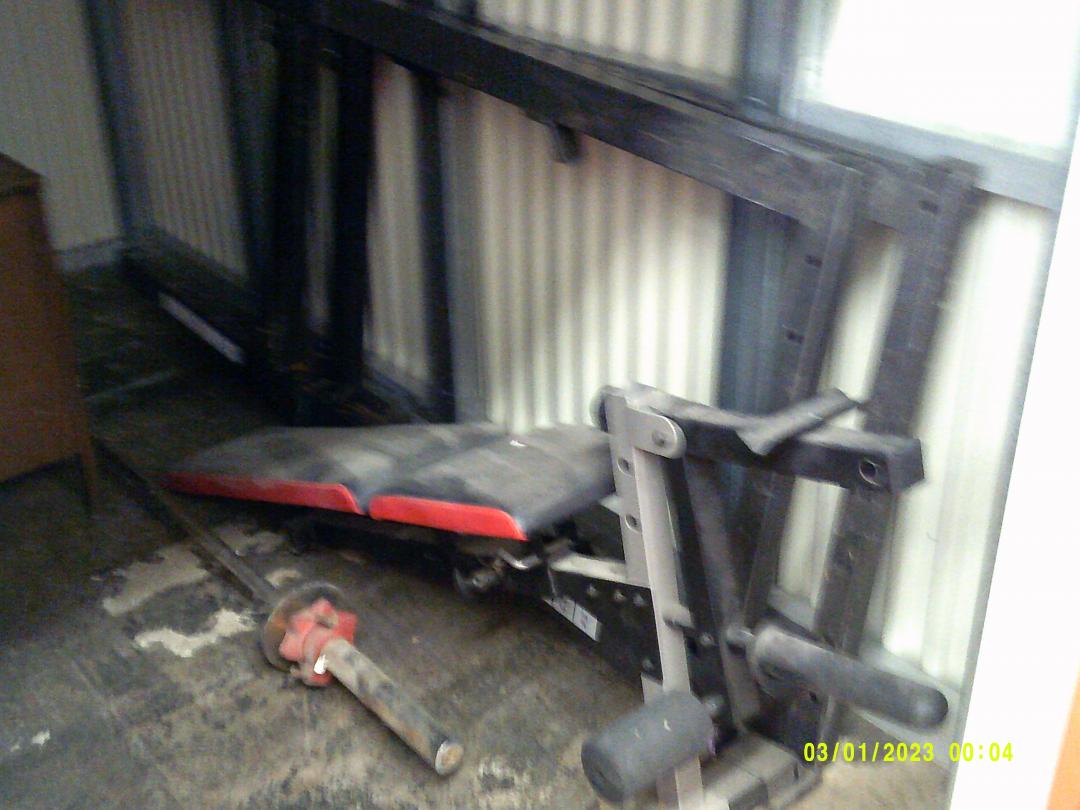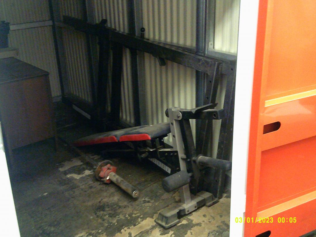 This unit appears to contain…READ ALL AUCTION RULES BEFORE BIDDING!!! Unit appears to contain: Workout Bench and bar, sewing machine, lights, jack stands, paint
