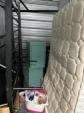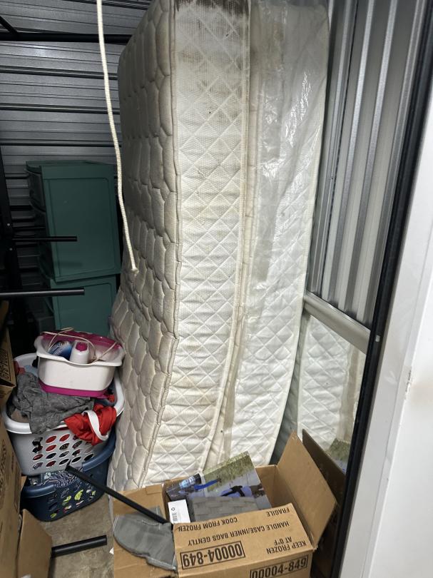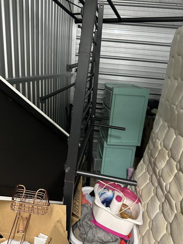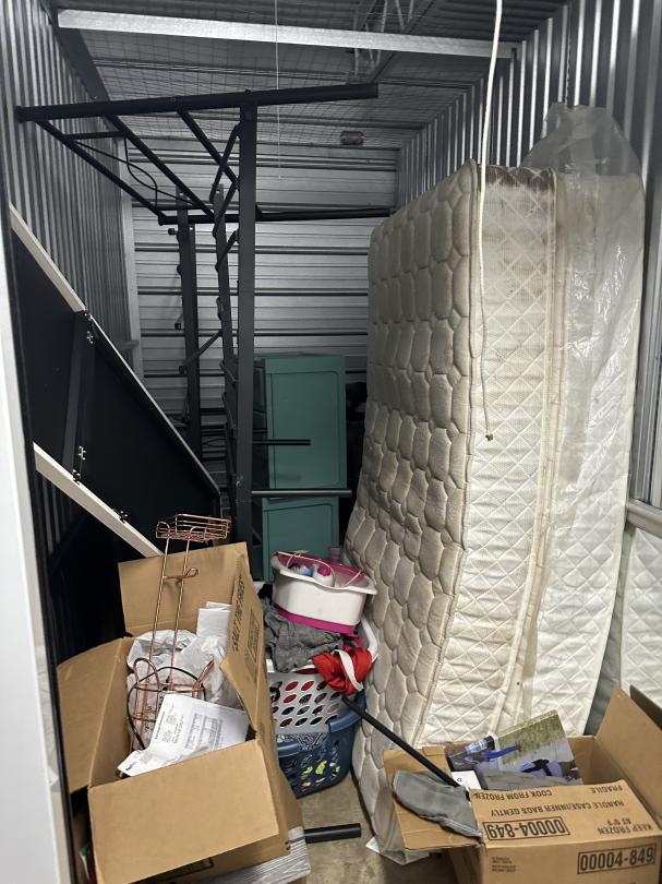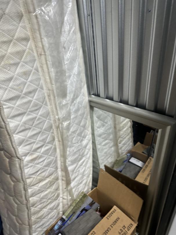 This unit appears to contain…TWIN MATTRESS, PLATIC DRAWER SET, BED FRAME, WALL ART, POTS AND PANS BOXES