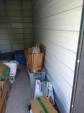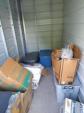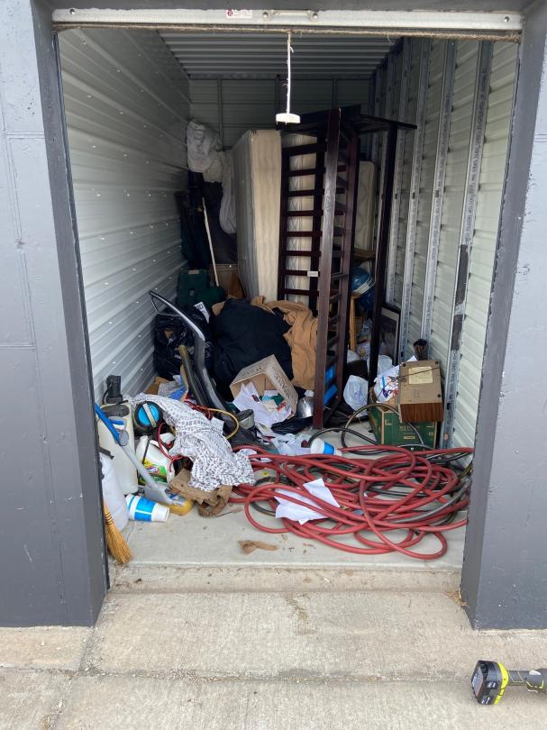 This unit appears to contain…Unit appears to contain. bed and bed frame, bedding, clothing, hose, tools, bags, boxes