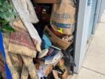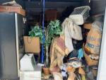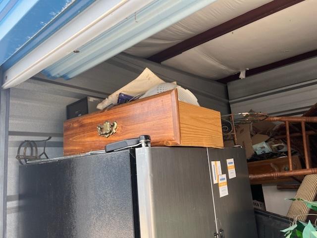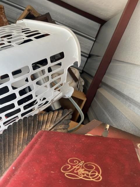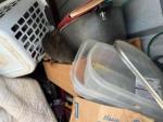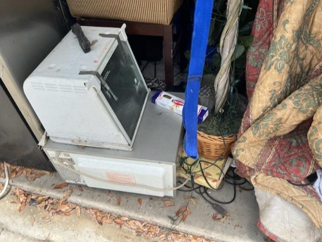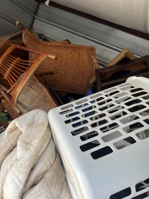This unit appears to contain…microwave, refrigerator, chairs, lamps, kitchenware, laundry baskets, box, plastic containers, misc.