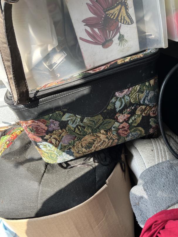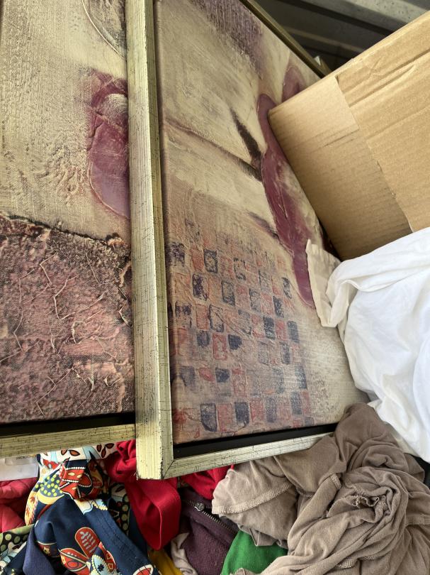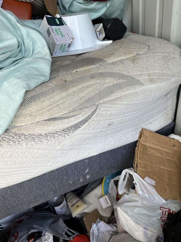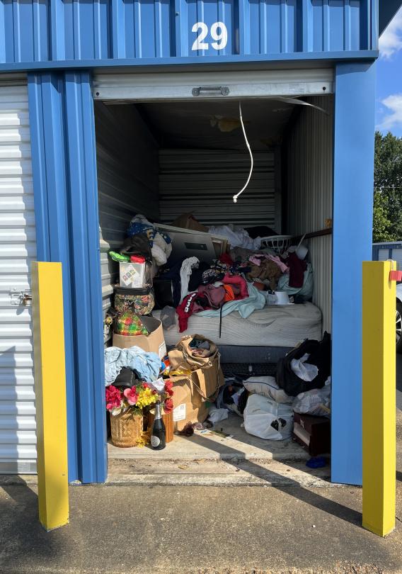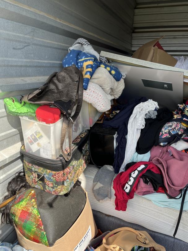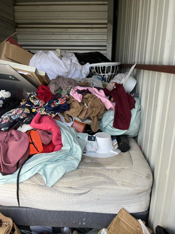 This unit appears to contain…Clothes, Mattress, Box Springs, Pictures, Purses, Rug, Kids toys
